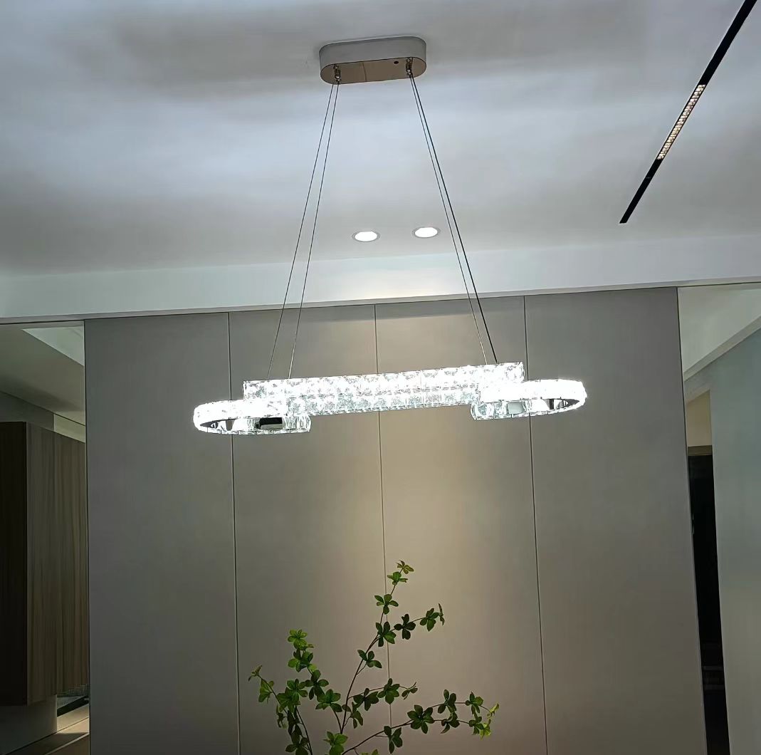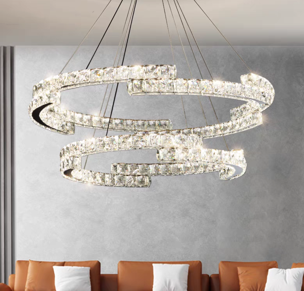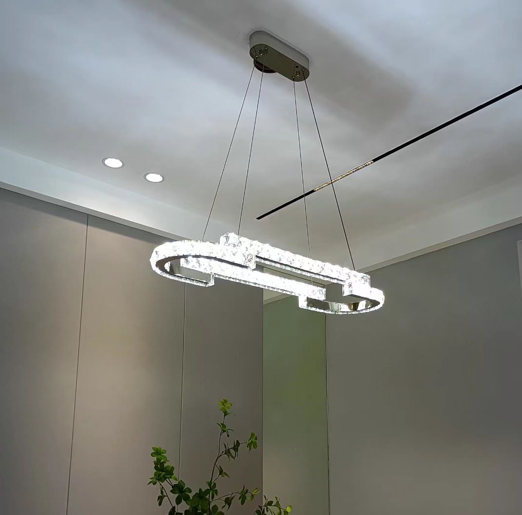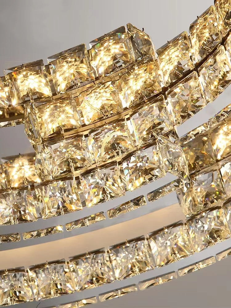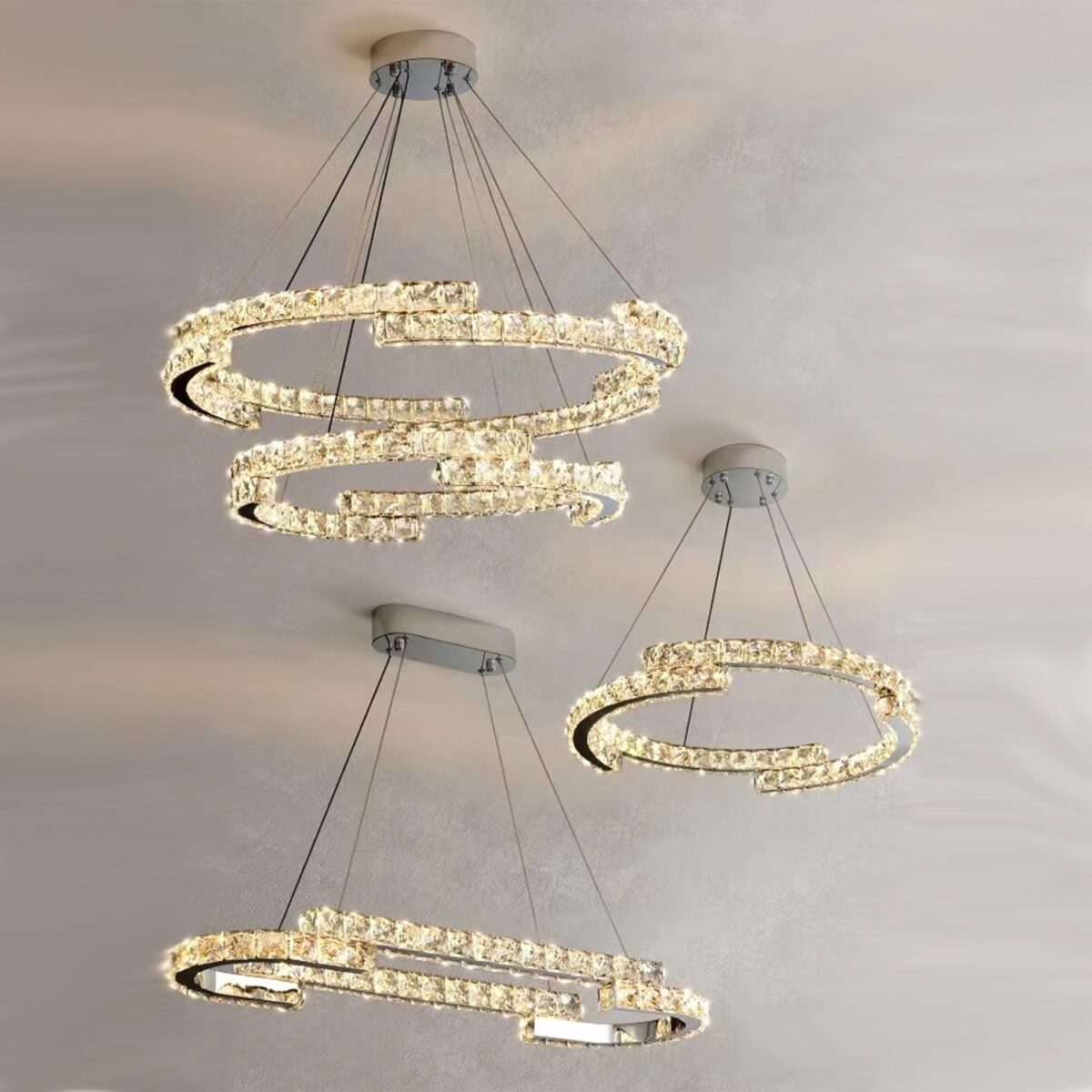 This chandelier set is designed in a modern light luxury style. The irregular circle design is one of its features, and the top and bottom are interlaced to form a staggered beauty. Numerous square-shaped crystals, surrounded by mirrored stainless steel bars, add a mysterious touch to the minimalist fixture. There are a variety of styles to choose from, single ring models and flush mount models suitable for installation in the bedroom, checkroom and other spaces, double ring style suitable for installation in the living room, the long oval model can be used as a dining pendant.