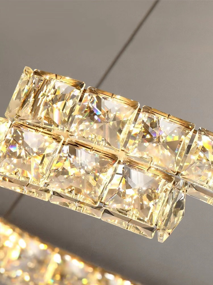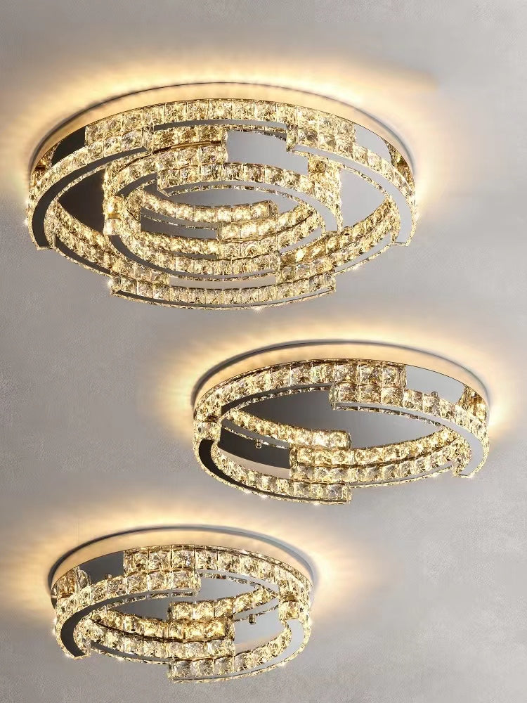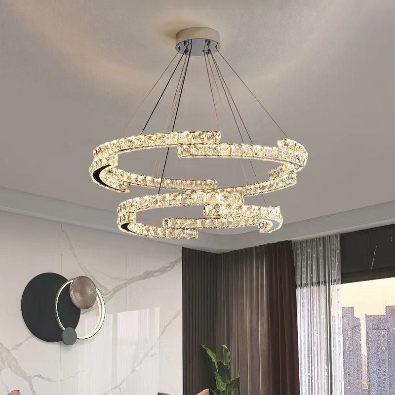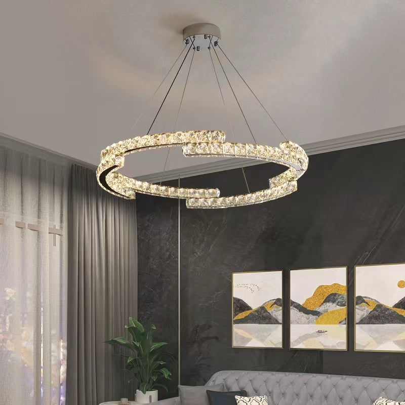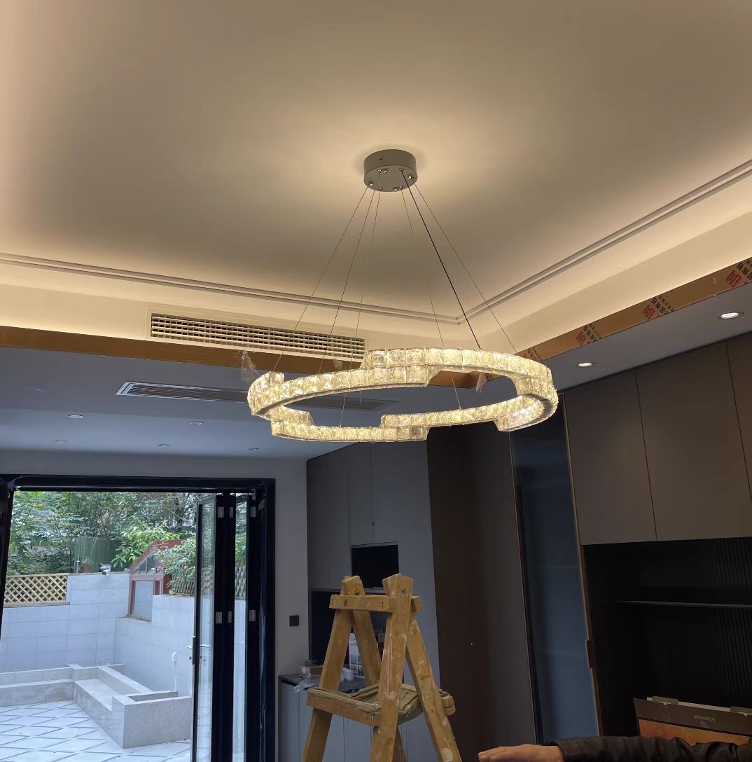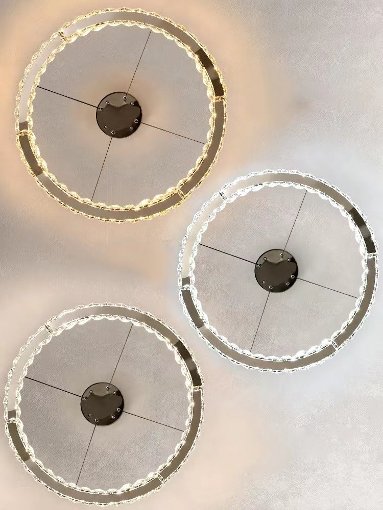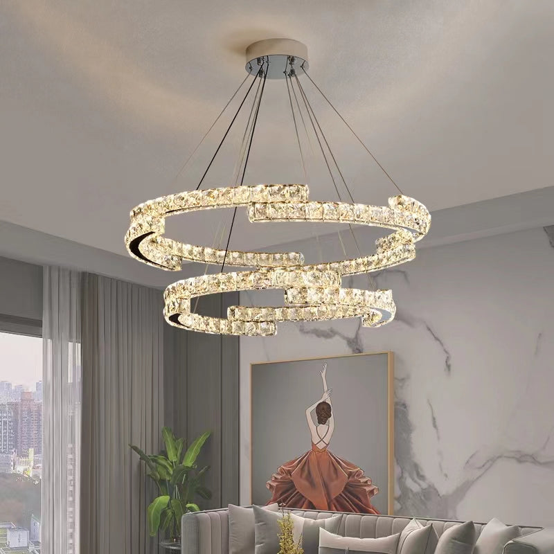 This chandelier set is designed in a modern light luxury style. The irregular circle design is one of its features, and the top and bottom are interlaced to form a staggered beauty. Numerous square-shaped crystals, surrounded by mirrored stainless steel bars, add a mysterious touch to the minimalist fixture. There are a variety of styles to choose from, single ring models and flush mount models suitable for installation in the bedroom, checkroom and other spaces, double ring style suitable for installation in the living room, the long oval model can be used as a dining pendant.