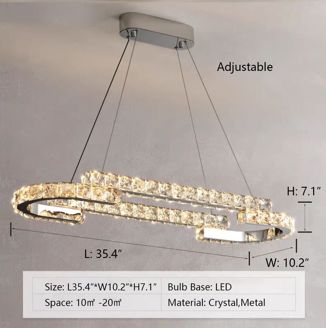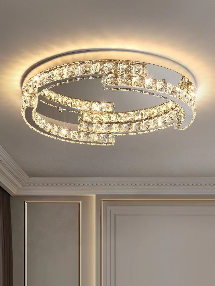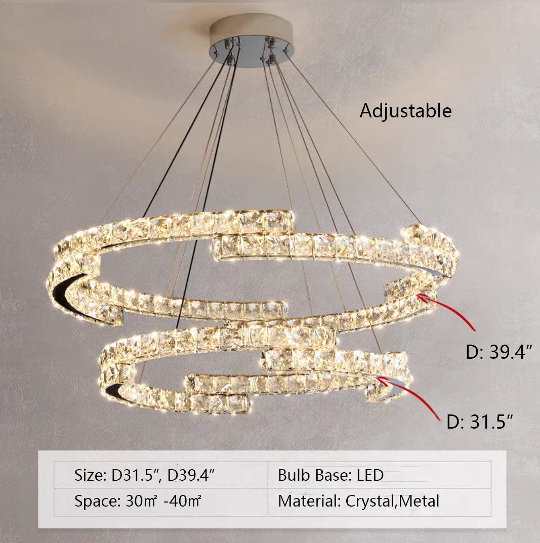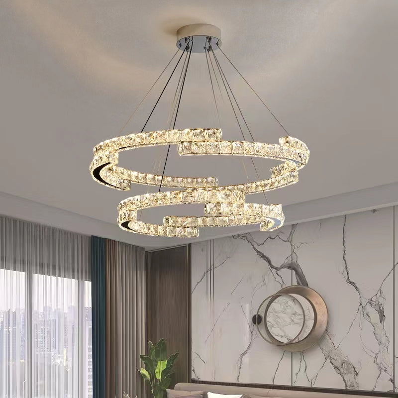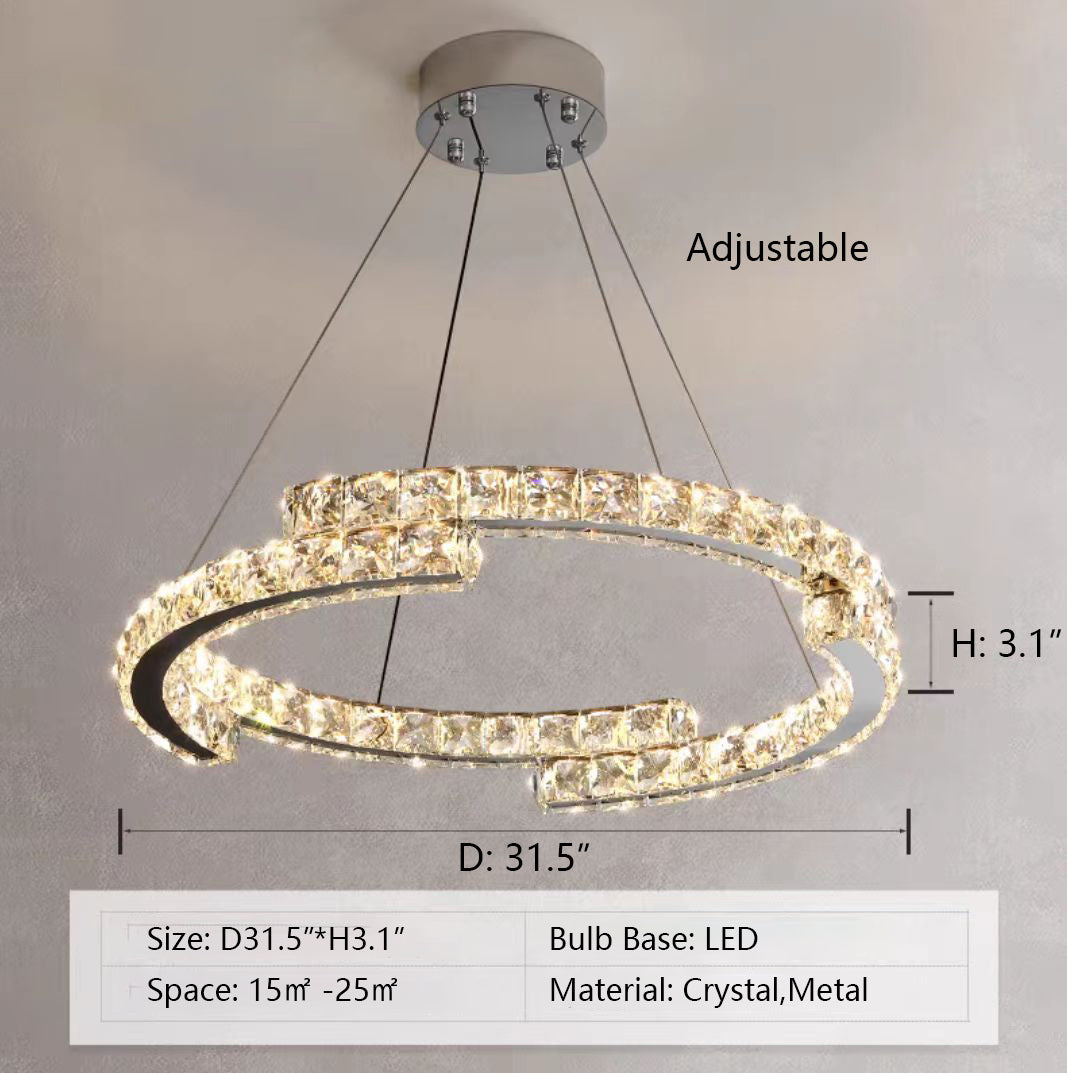 This chandelier set is designed in a modern light luxury style. The irregular circle design is one of its features, and the top and bottom are interlaced to form a staggered beauty. Numerous square-shaped crystals, surrounded by mirrored stainless steel bars, add a mysterious touch to the minimalist fixture. There are a variety of styles to choose from, single ring models and flush mount models suitable for installation in the bedroom, checkroom and other spaces, double ring style suitable for installation in the living room, the long oval model can be used as a dining pendant.