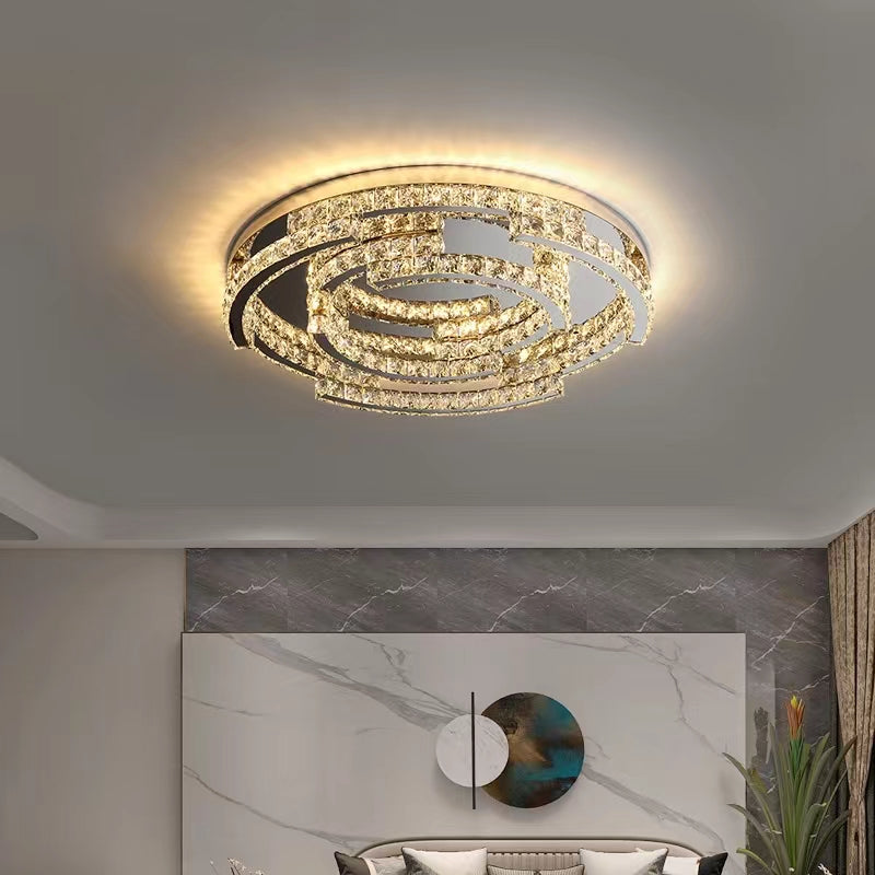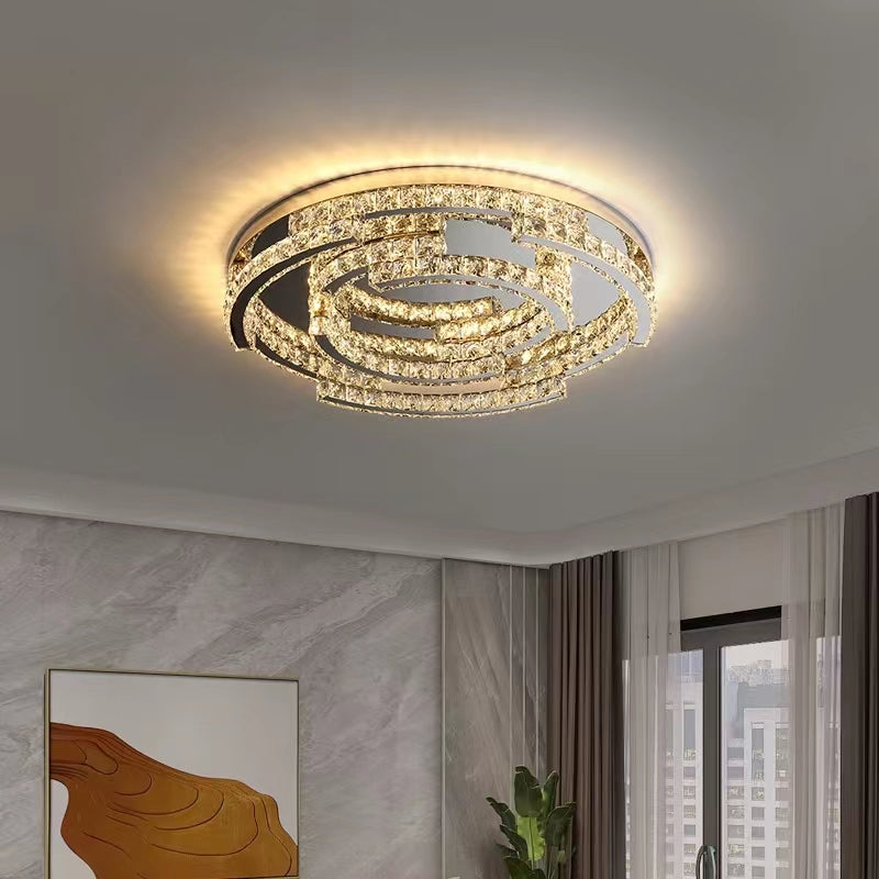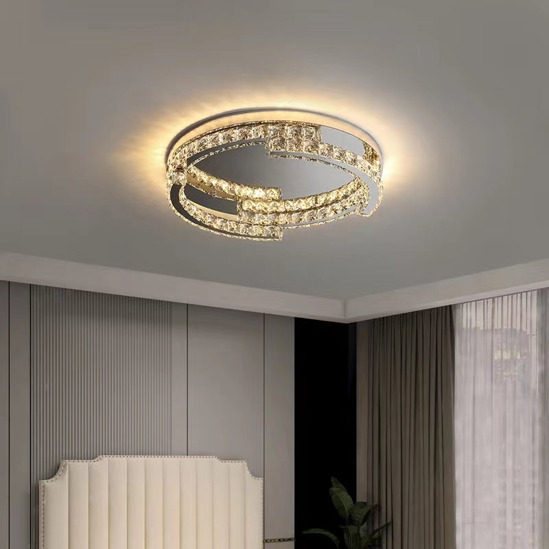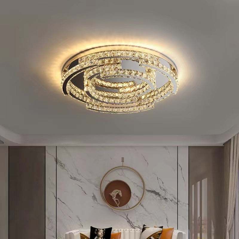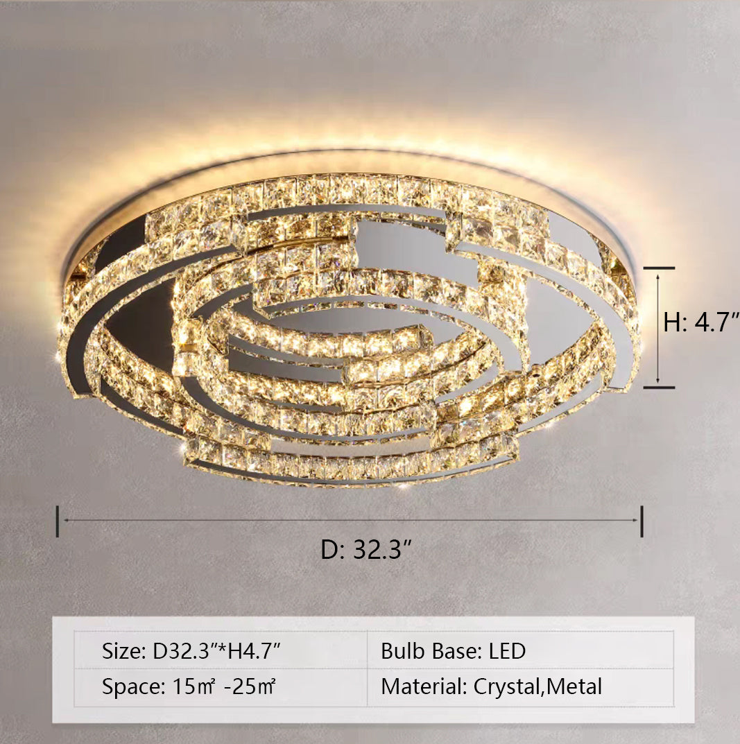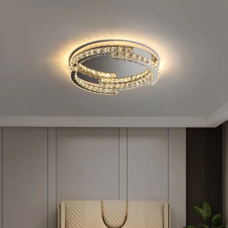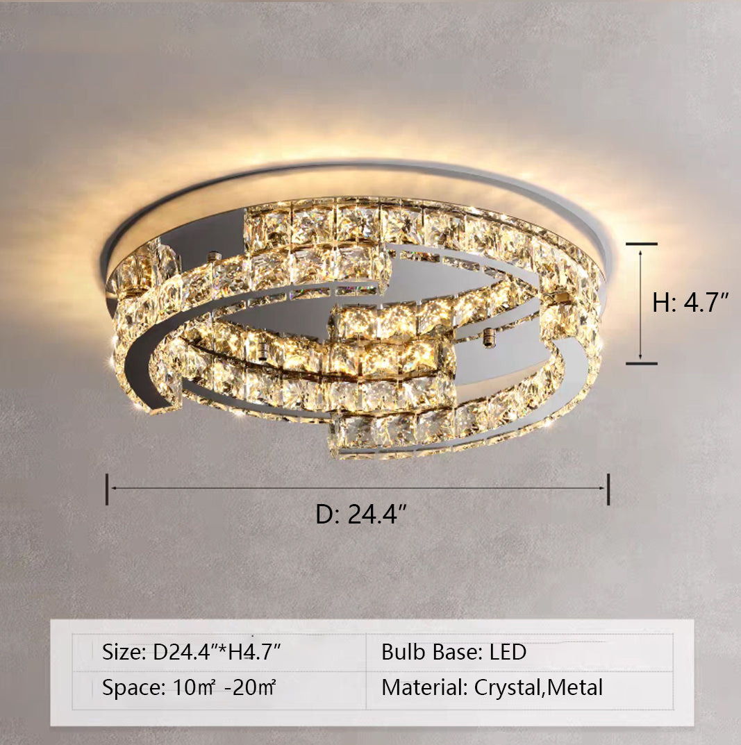 This chandelier set is designed in a modern light luxury style. The irregular circle design is one of its features, and the top and bottom are interlaced to form a staggered beauty. Numerous square-shaped crystals, surrounded by mirrored stainless steel bars, add a mysterious touch to the minimalist fixture. There are a variety of styles to choose from, single ring models and flush mount models suitable for installation in the bedroom, checkroom and other spaces, double ring style suitable for installation in the living room, the long oval model can be used as a dining pendant.