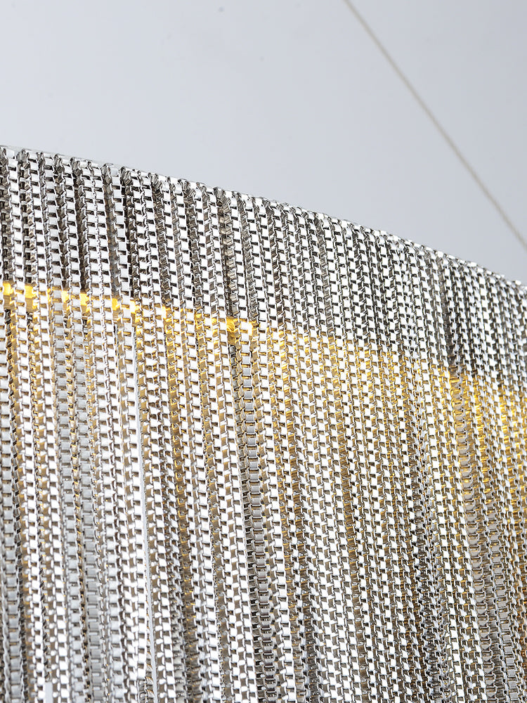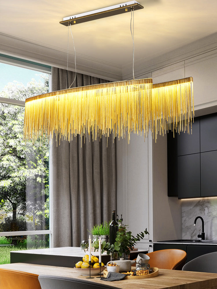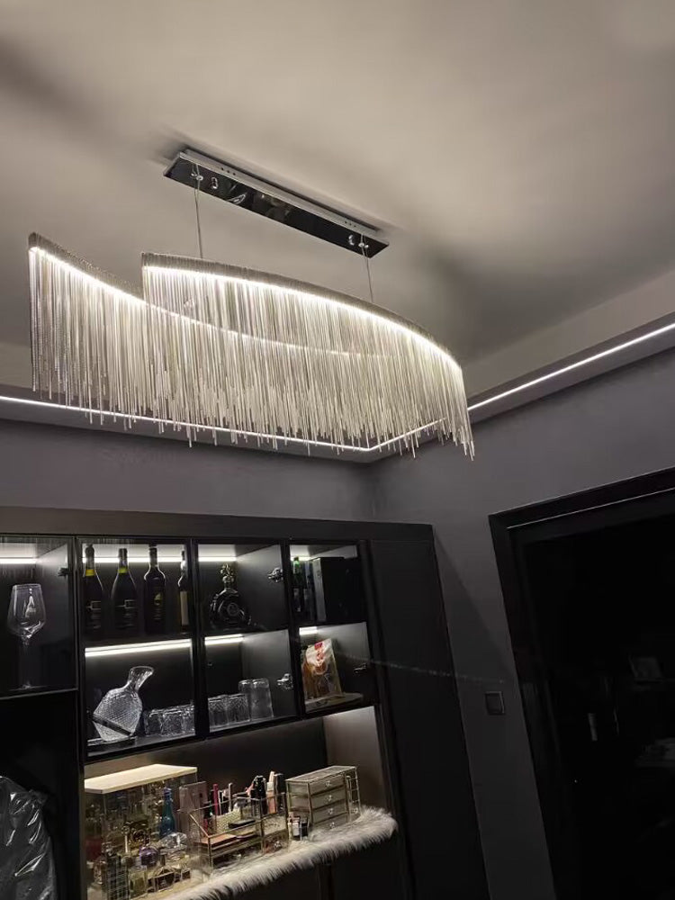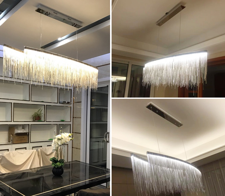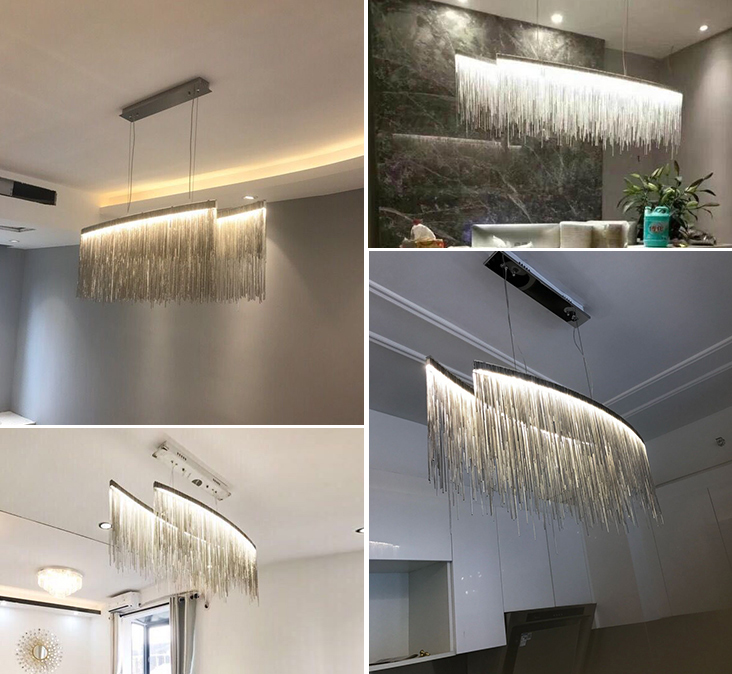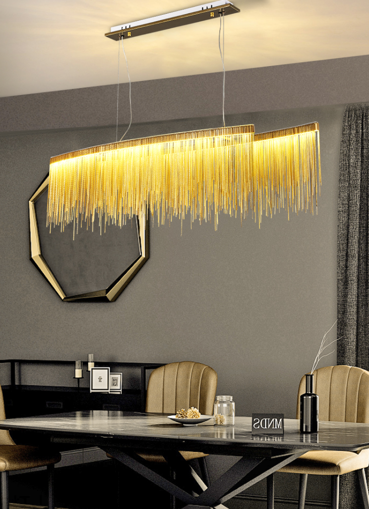 This artistic chandelier features a unique design in the irregular form of two linear pieces of tassel, which is made of aluminum. Like a curtain with rich texture and fabulous luster, lighting up any space for a dazzling effect. Modern light form with elegance and decency makes it a visual focal point in your home. Available in two colors: cool chrome or luxurious gold. Perfect for modern living/dining room, kitchen island, bar, etc.