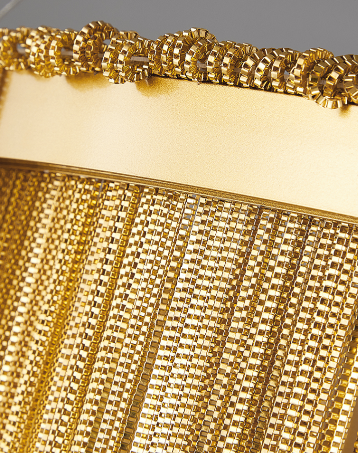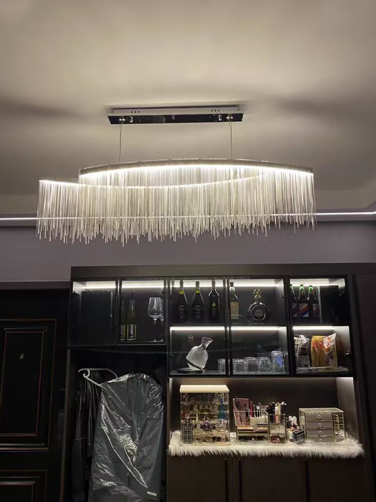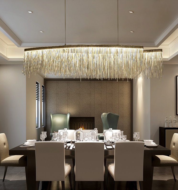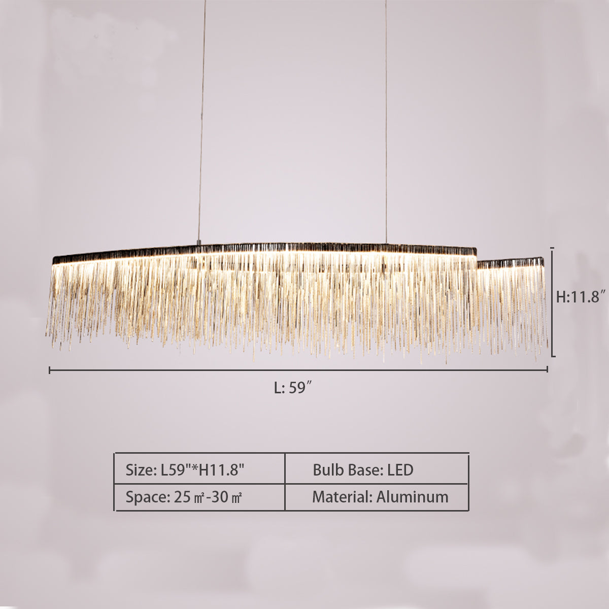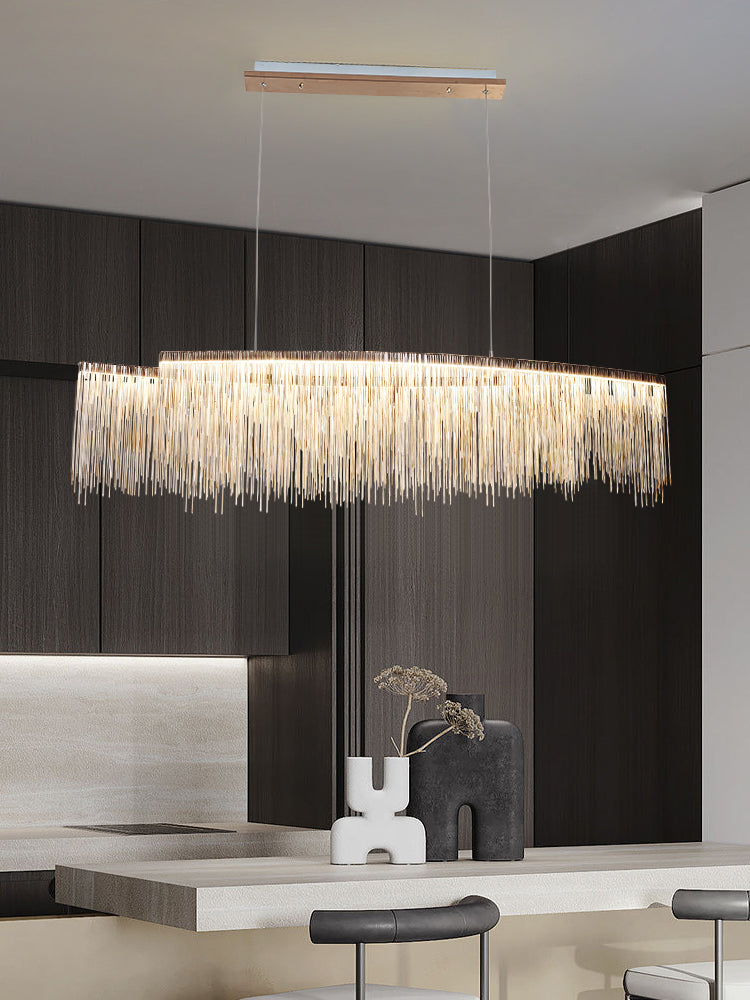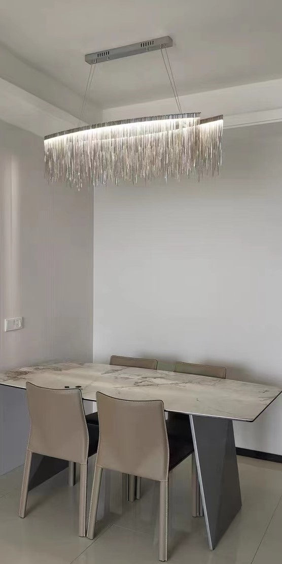 This artistic chandelier features a unique design in the irregular form of two linear pieces of tassel, which is made of aluminum. Like a curtain with rich texture and fabulous luster, lighting up any space for a dazzling effect. Modern light form with elegance and decency makes it a visual focal point in your home. Available in two colors: cool chrome or luxurious gold. Perfect for modern living/dining room, kitchen island, bar, etc.
