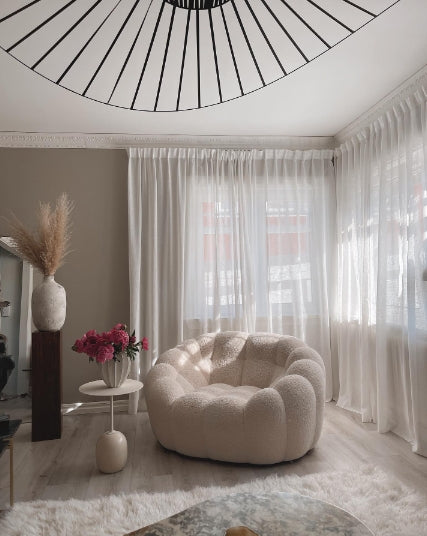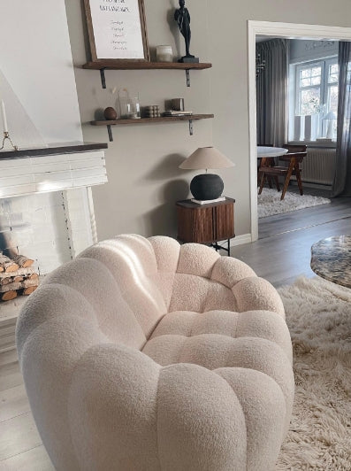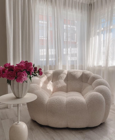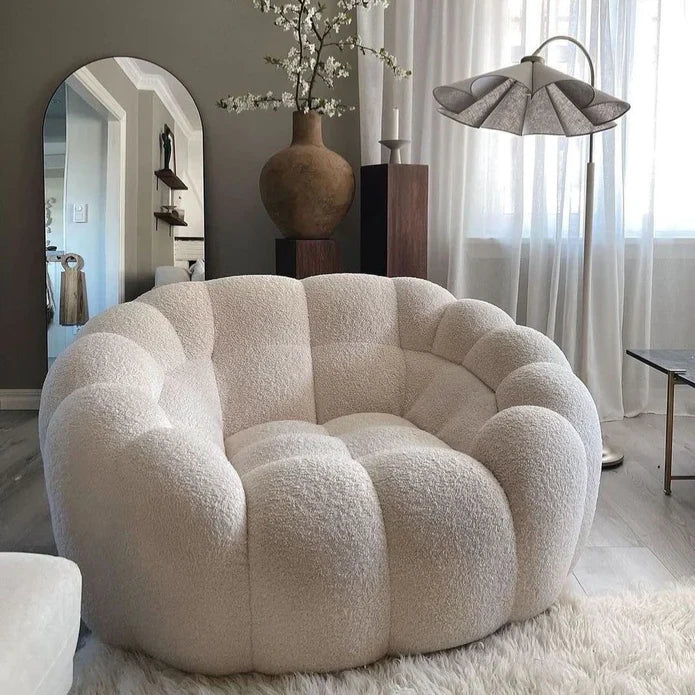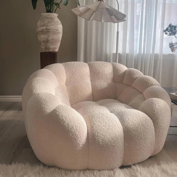 This cream white sofa chair is not only stylishly designed but also soft to the touch, making it the perfect furniture piece for a comfortable and immersive living experience. Its intricate design details make it stand out and it is made of Teddy Bear materials which make its cushions exceptionally soft. Constructed with wood and plywood frames, this durable chair is perfect for any home.