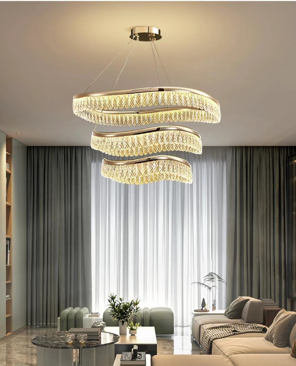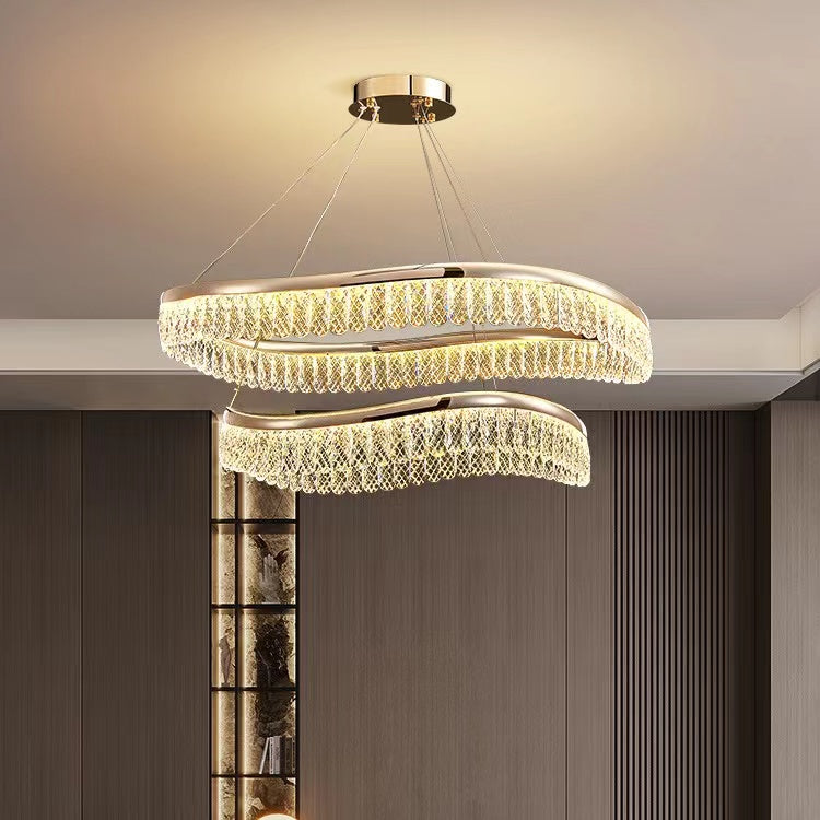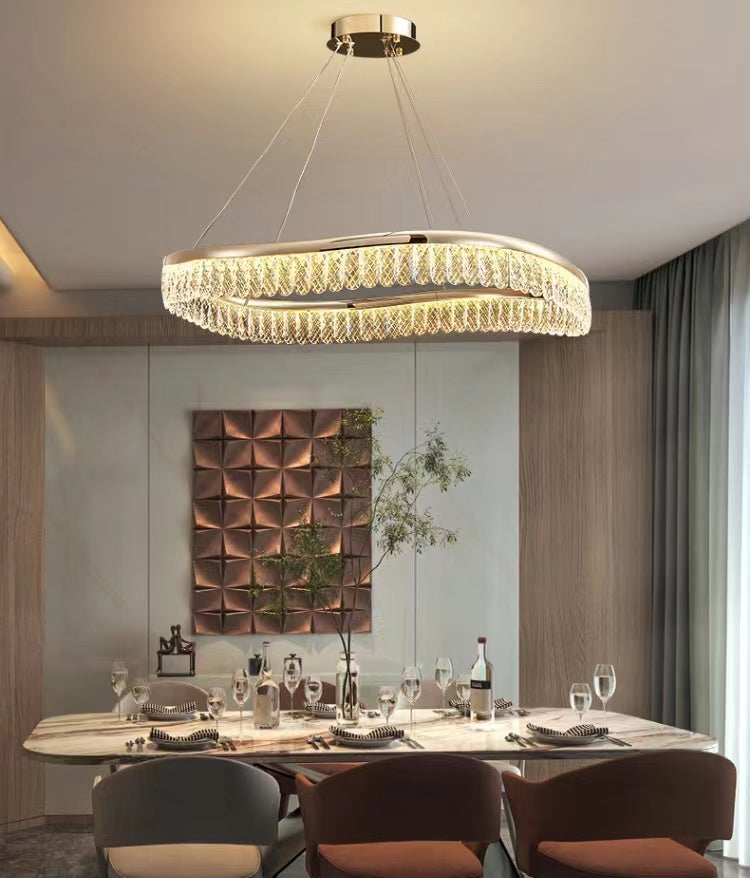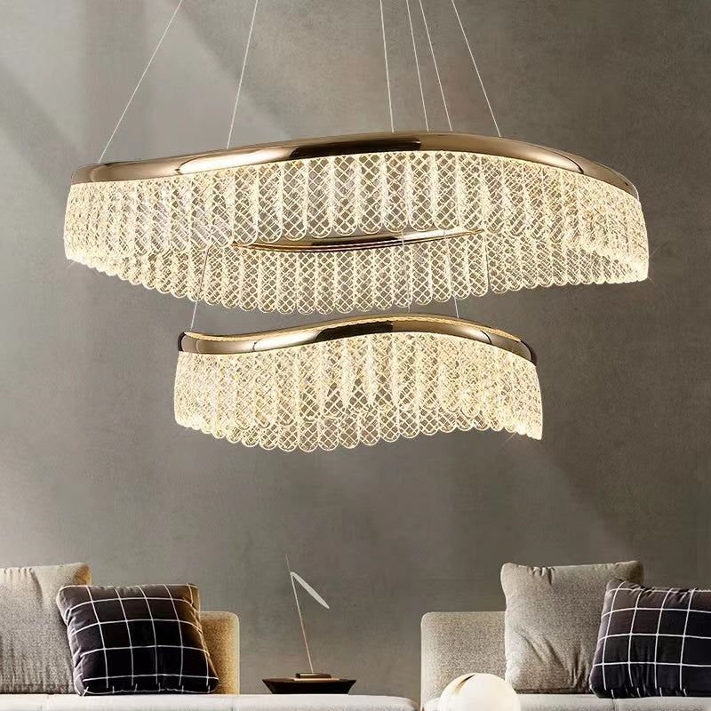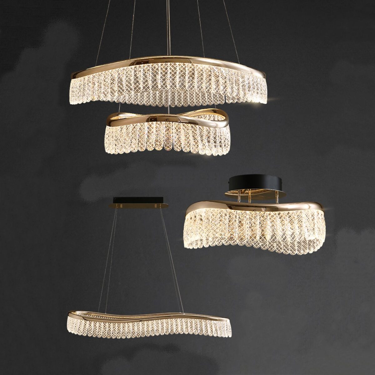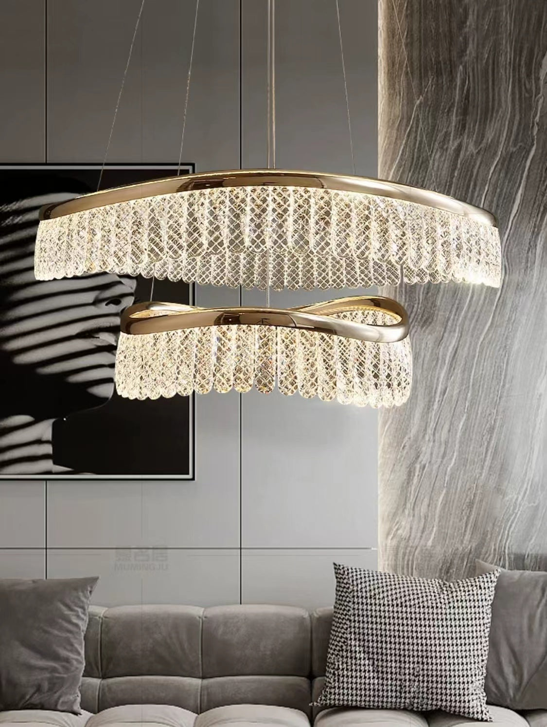 This glamorous chandelier suit features a unique design of curved metal rings trimmed with crystal rods. Meanwhile, the crystal rods are faced cut of woven surface, which refract light from multi angles. The plated aluminum finish showcases a layer of luxury in gold color. The curved form represents an aesthetic of unconventional creation in a post-modern style. Three types in this suit: one single ring–for bedroom or living room; double-tiered rings–for large living room; and one single oval design– for dining table or kitchen island.