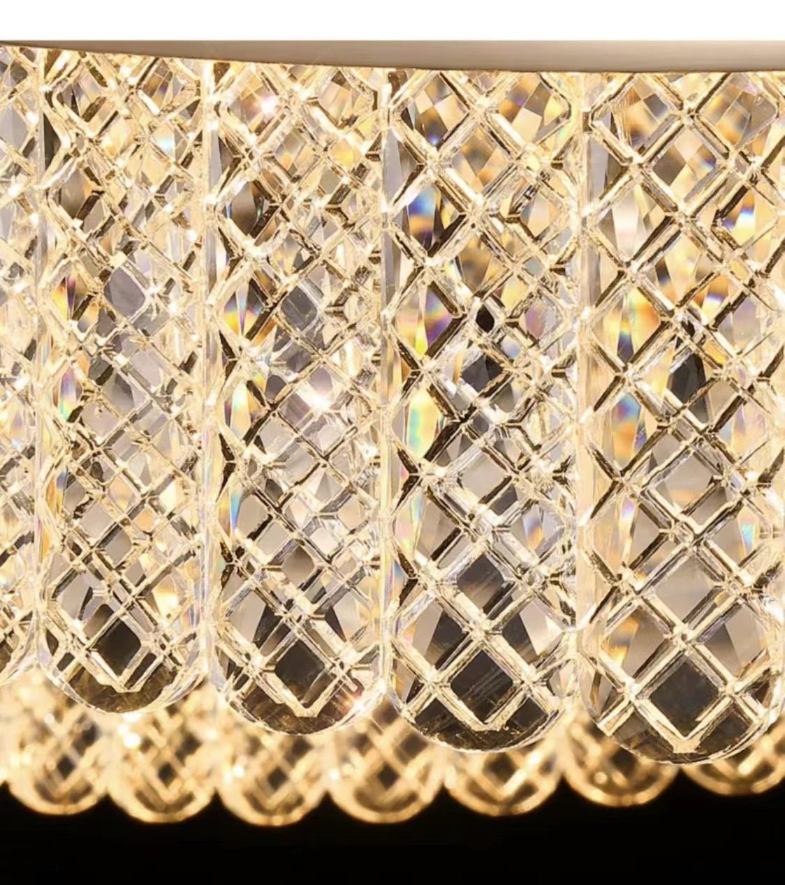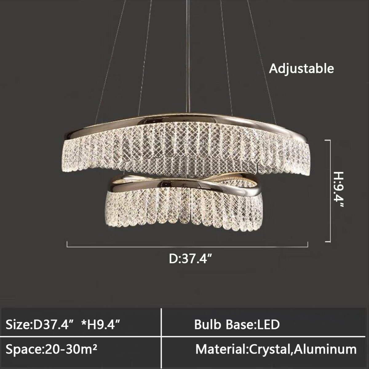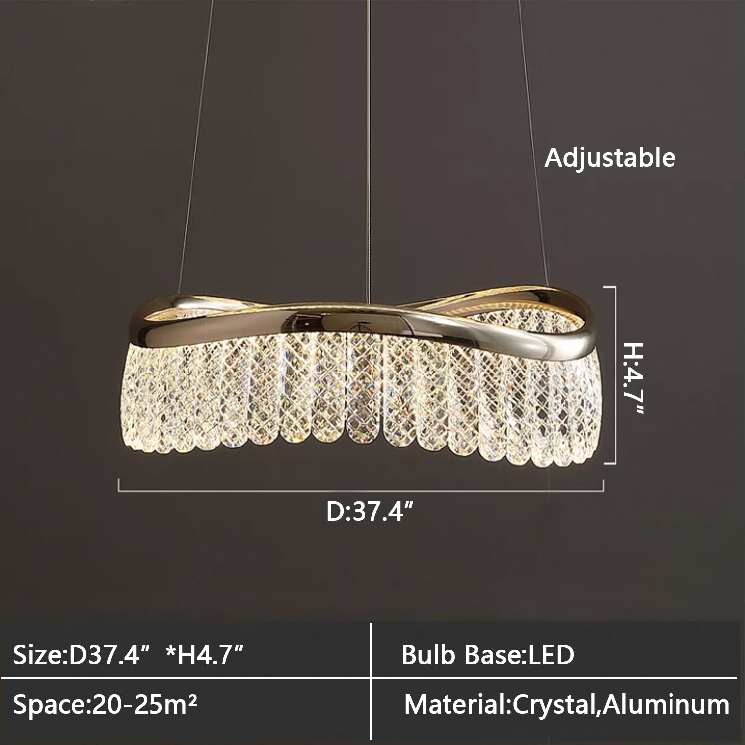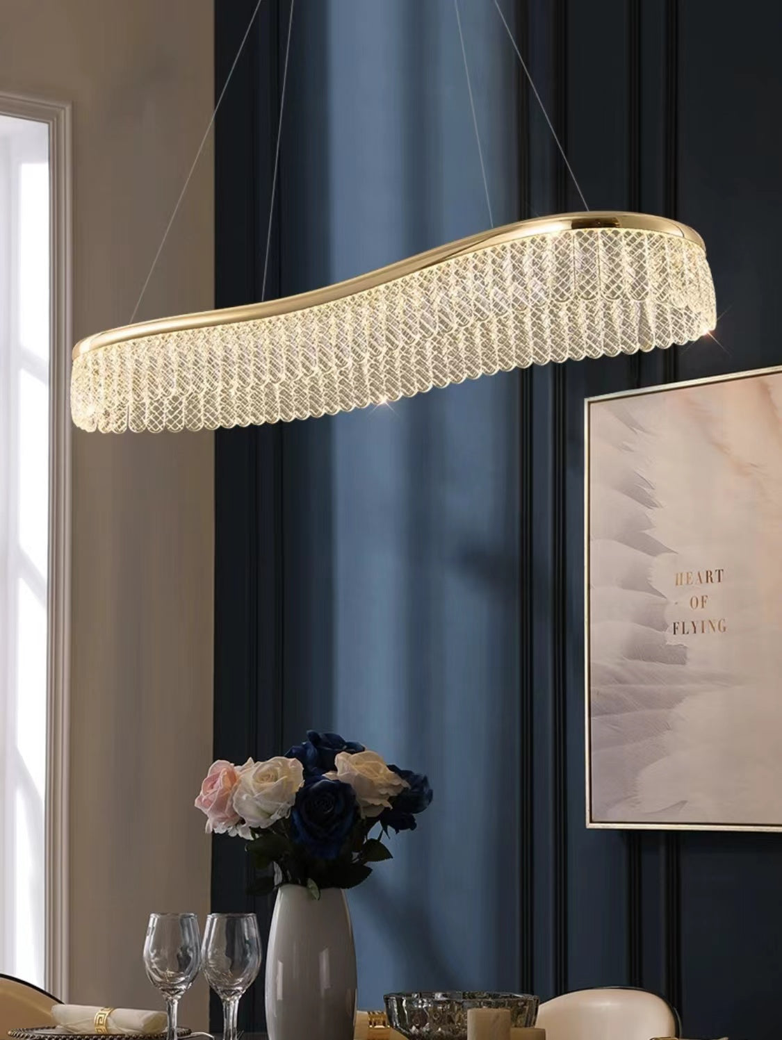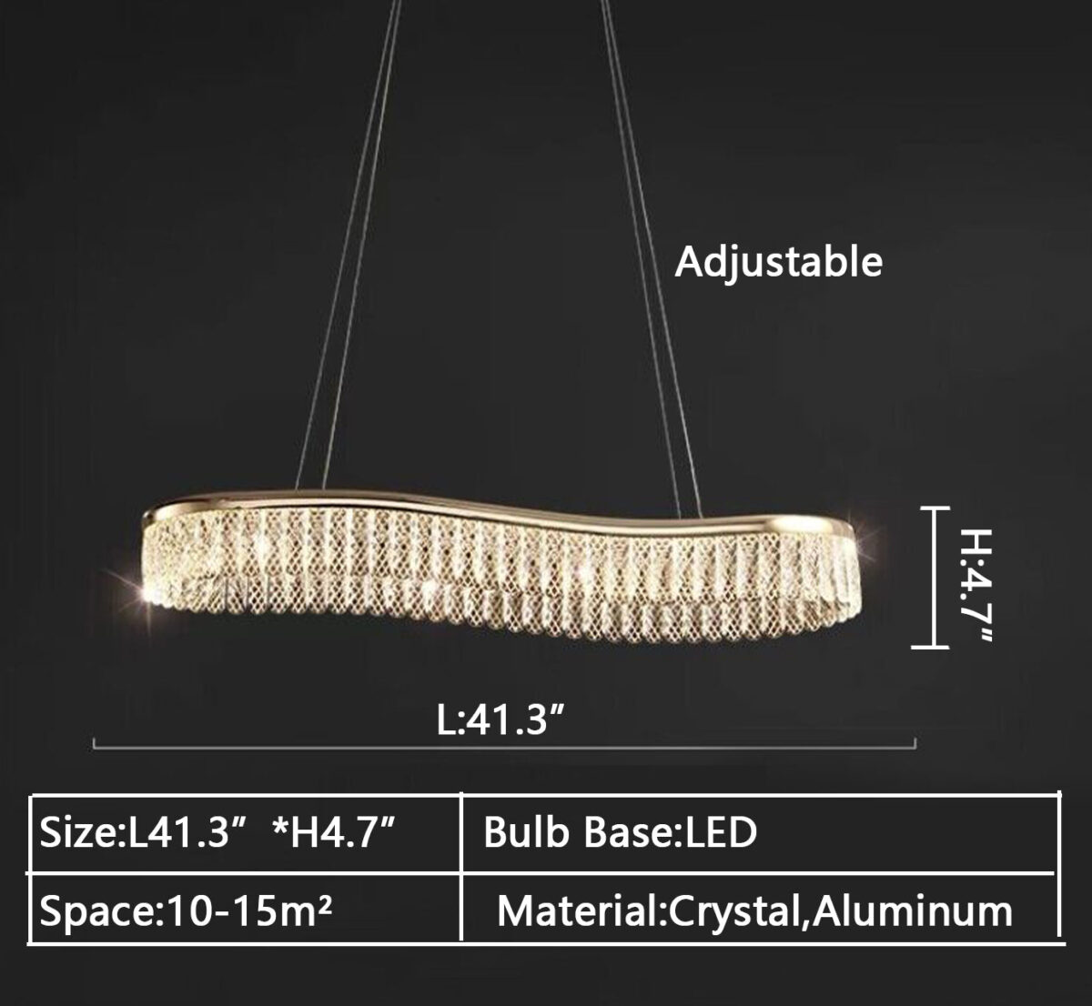 This glamorous chandelier suit features a unique design of curved metal rings trimmed with crystal rods. Meanwhile, the crystal rods are faced cut of woven surface, which refract light from multi angles. The plated aluminum finish showcases a layer of luxury in gold color. The curved form represents an aesthetic of unconventional creation in a post-modern style. Three types in this suit: one single ring–for bedroom or living room; double-tiered rings–for large living room; and one single oval design– for dining table or kitchen island.