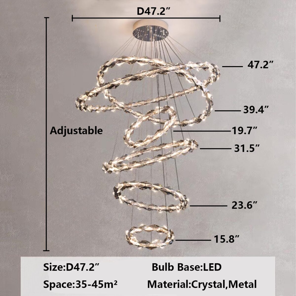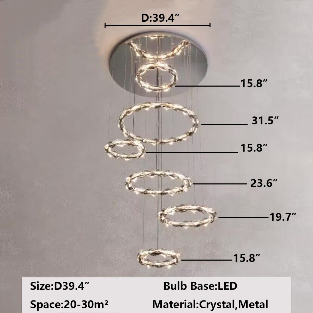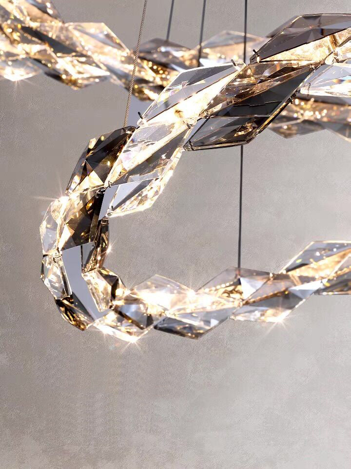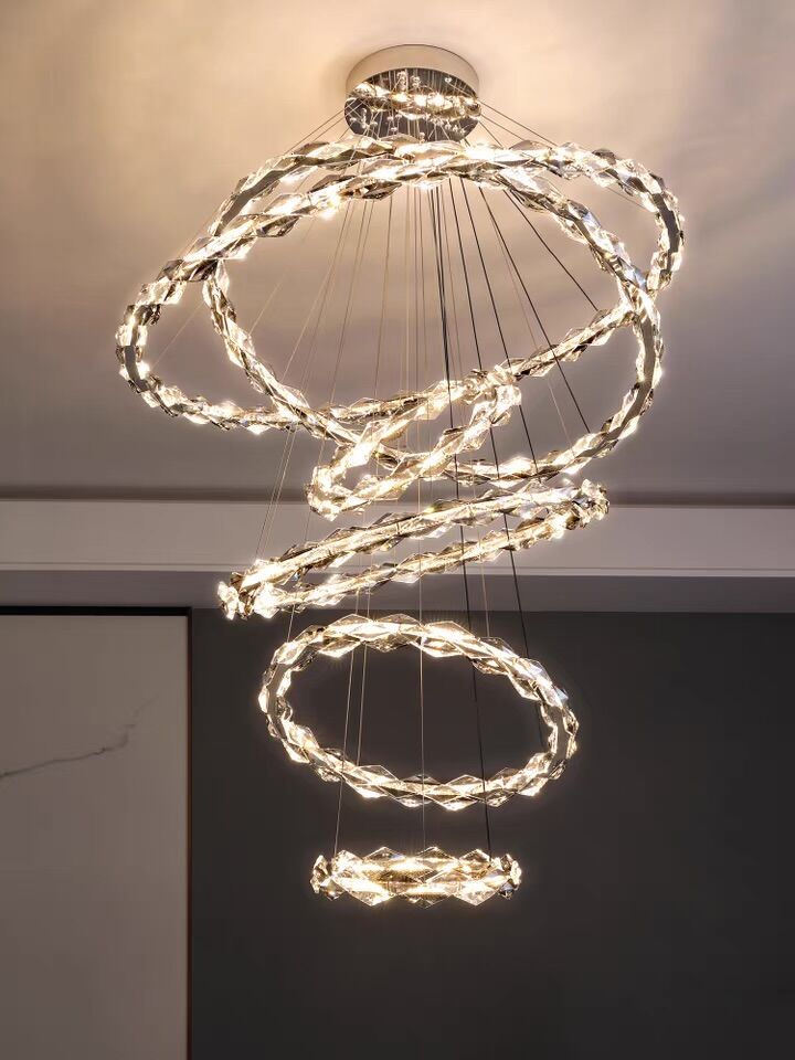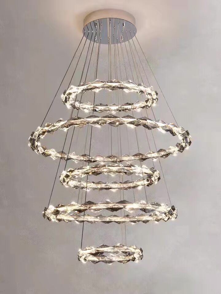 Modern light luxury design aesthetics, adding gray crystals to the original clear crystal, adding a sense of luxury and layering of this lamp, different sizes of rings staggered, or neatly arranged, or rotating, pulling up the sense of use of space, this lamp is simple and advanced, very suitable for decorating a large space, adding a sense of happiness in the home.