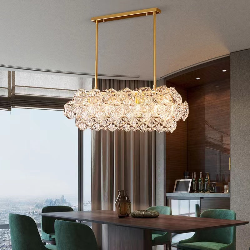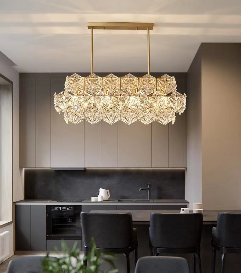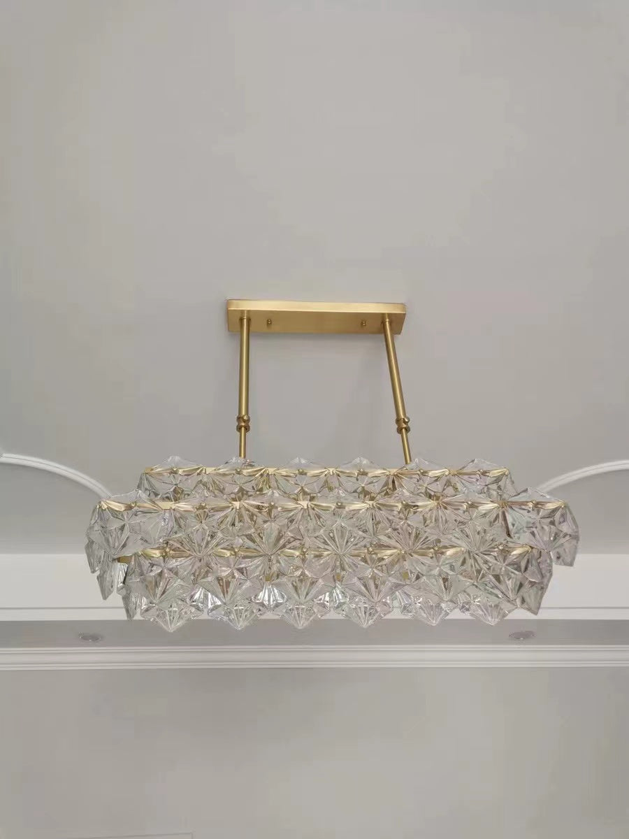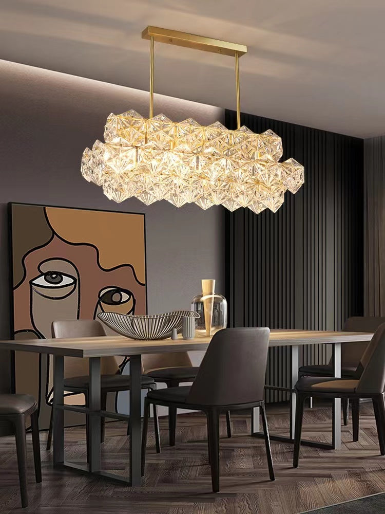 This sculpture chandelier features the geometrical shape of the classic chandelier outline and turned it into a diamond-like hexagonal crystal unit. Polished golden brass as the main material guarantees the high quality of corrosion and rust protection, supports for long-term usage. On its own, with just single pendant, or in combination of multiple items into a large chandelier, the facet components stand out as clear, disciplined and geometrical. Perfect for long dining table, kitchen island, water bar, etc.