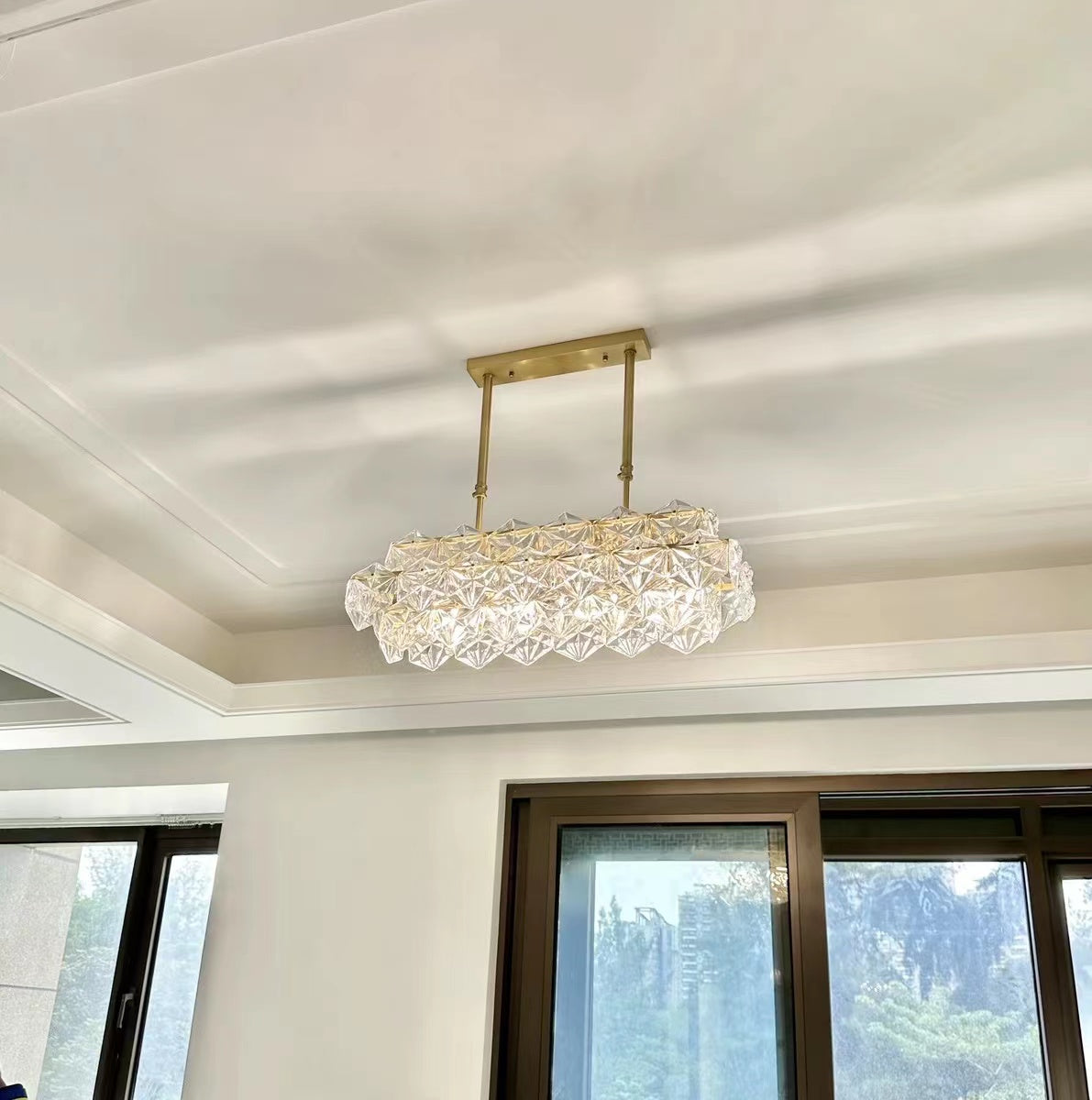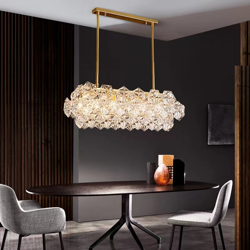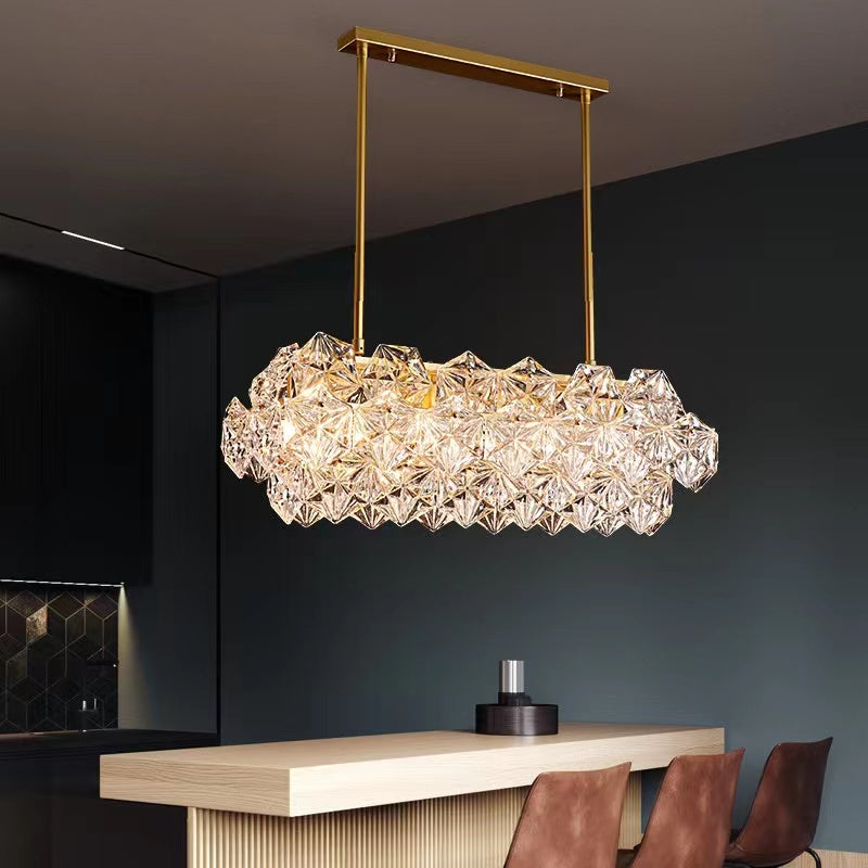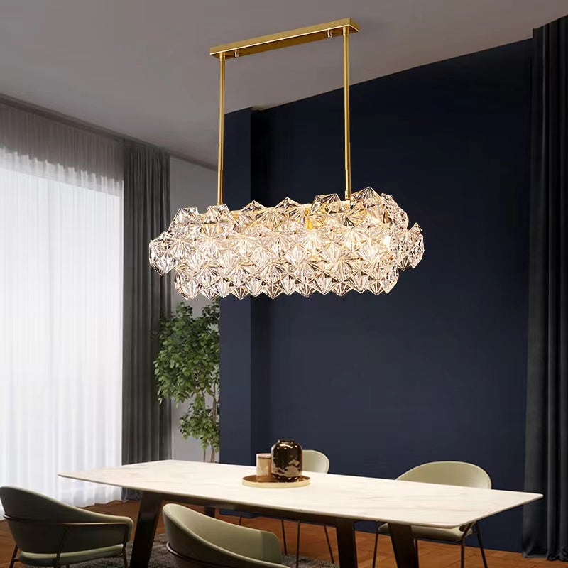 This sculpture chandelier features the geometrical shape of the classic chandelier outline and turned it into a diamond-like hexagonal crystal unit. Polished golden brass as the main material guarantees the high quality of corrosion and rust protection, supports for long-term usage. On its own, with just single pendant, or in combination of multiple items into a large chandelier, the facet components stand out as clear, disciplined and geometrical. Perfect for long dining table, kitchen island, water bar, etc.