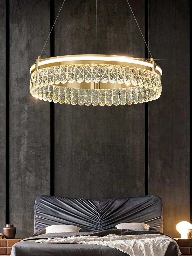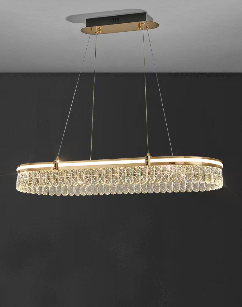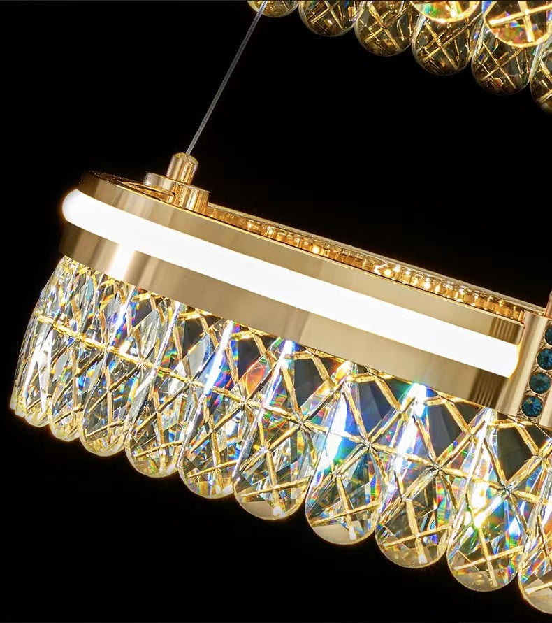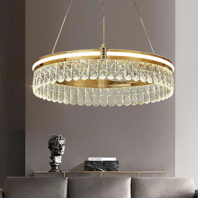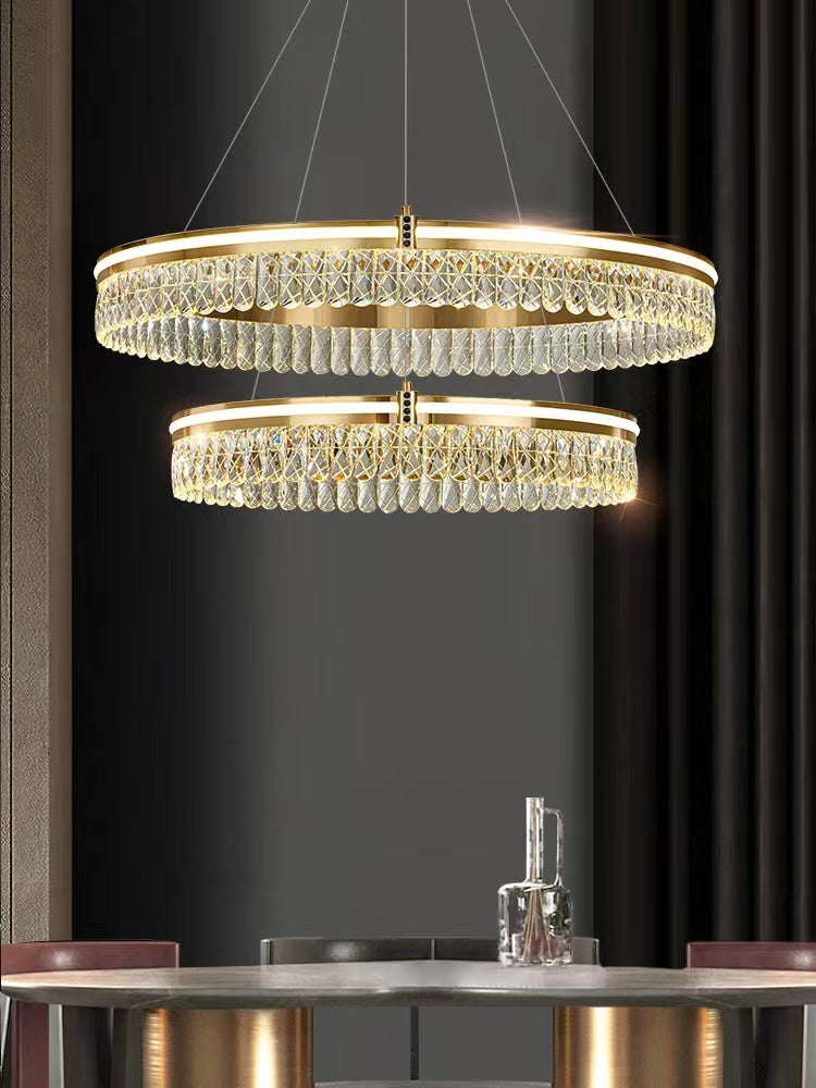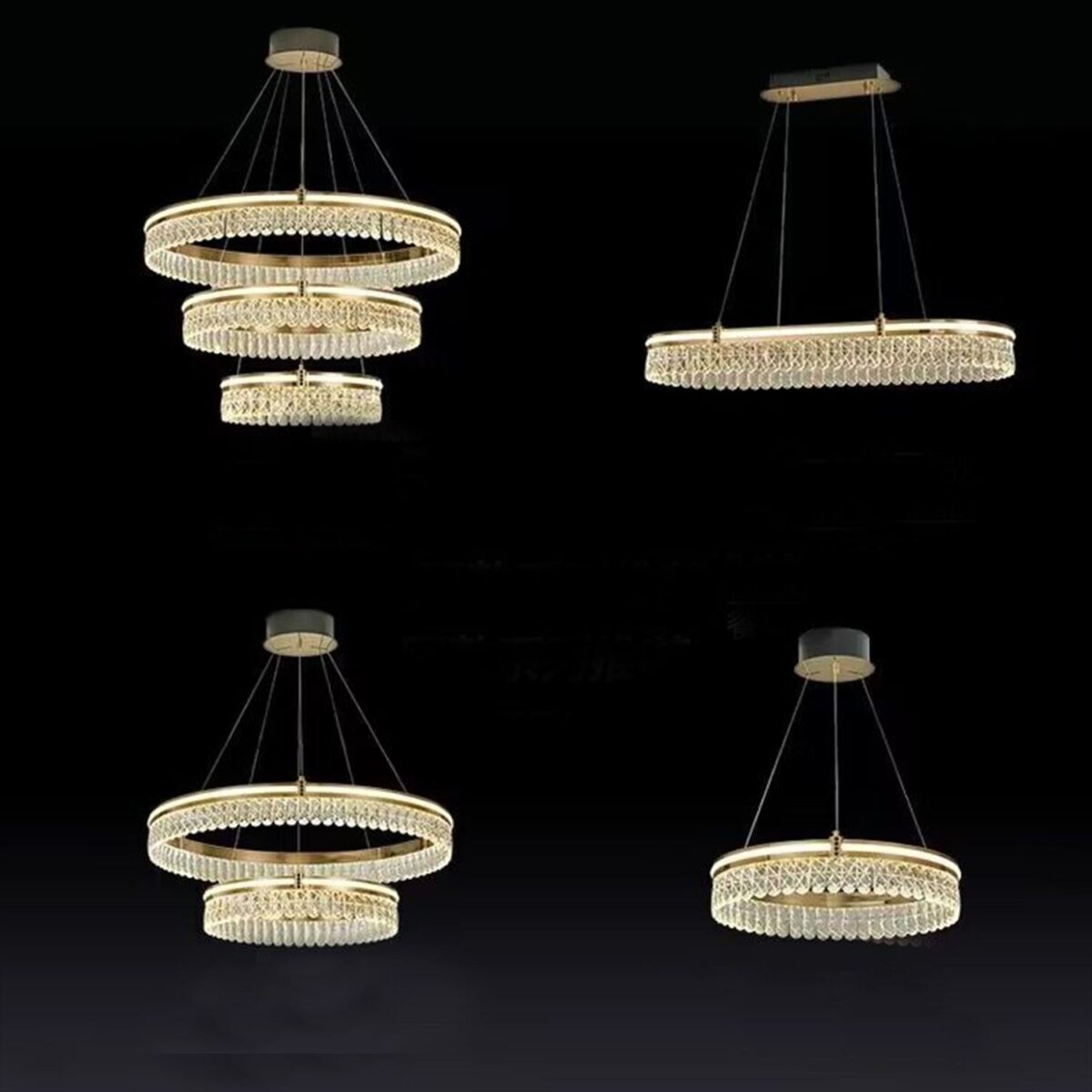 A modern style to grab entice your eyes. Three different types are included in this suit. One single grand ring pendant design: showcase a number of crystal rod accents to enhance the illumination, while a warm gold finish complements the design. Double-tiered rings design: offer abundant illumination with soft and gentle ambience, prefect for living room. One single oval design: suited to kitchen island or dining table. This light fixture comes with a 39 in. adjustable chain is perfect for custom ceiling heights and room sizes.