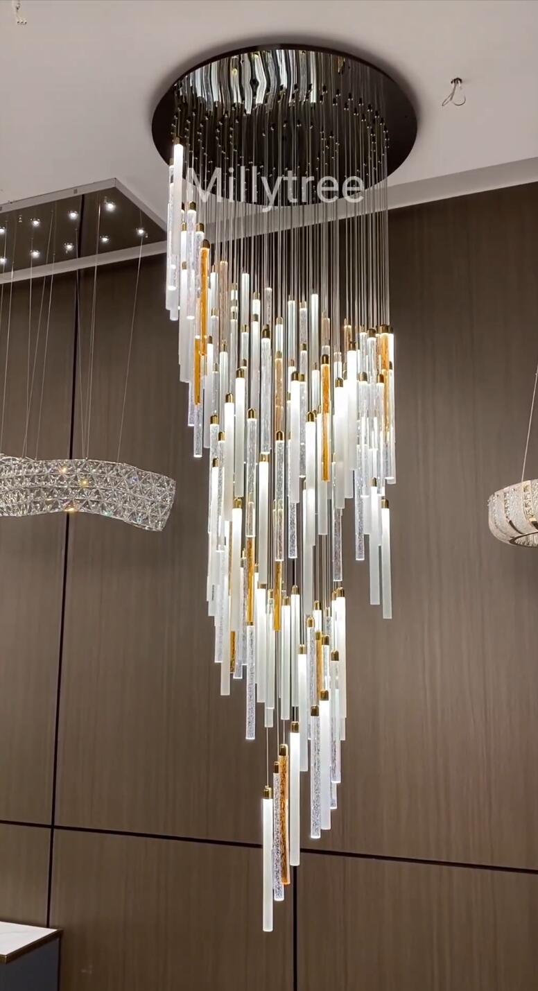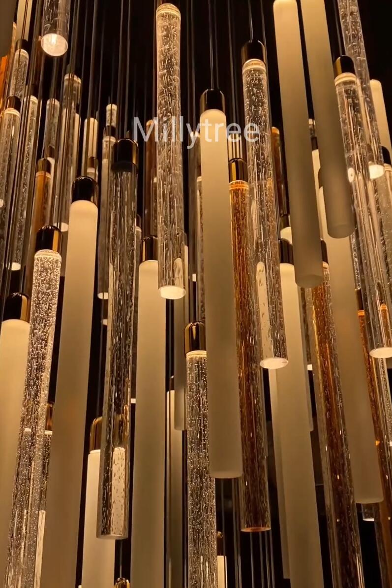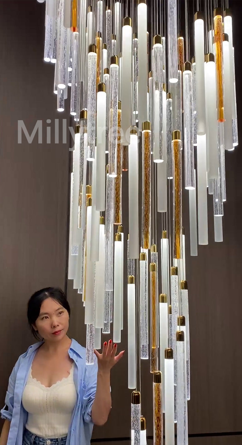 Modern Floating Clear&Orange Cylindrical Crystal Chandelier for High-ceiling