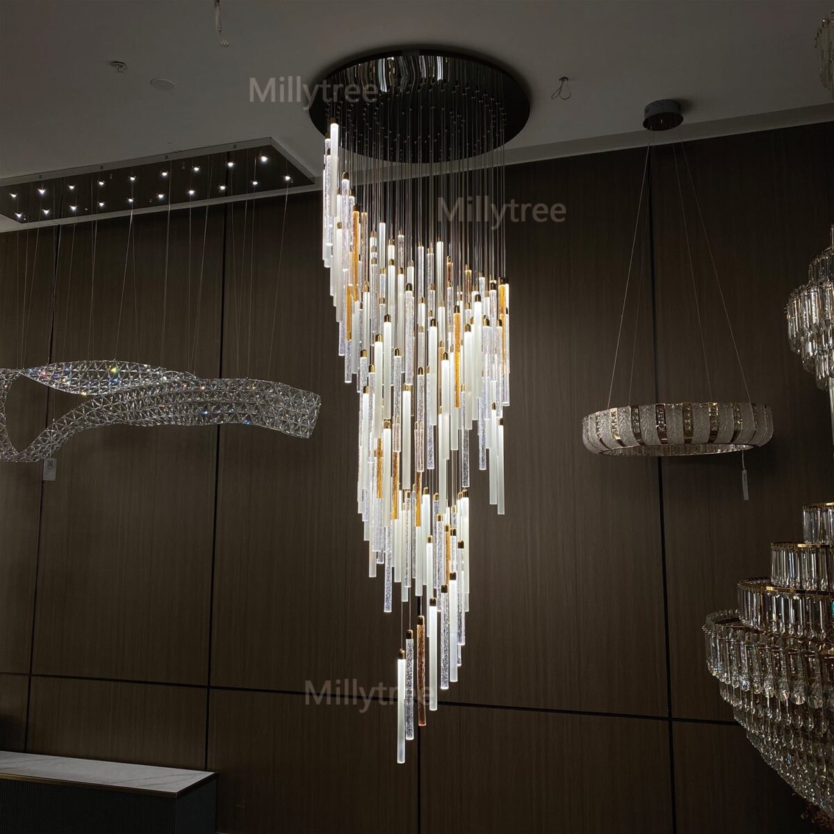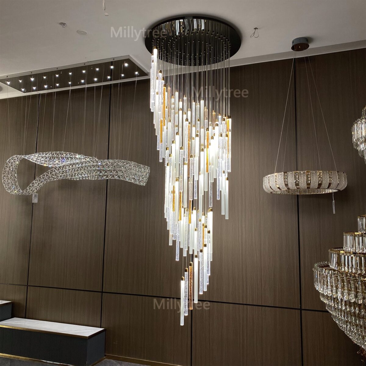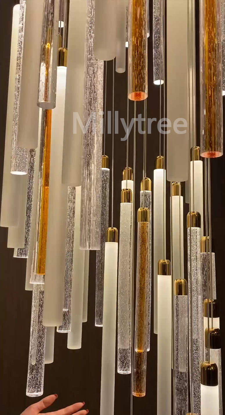 Modern Floating Clear&Orange Cylindrical Crystal Chandelier for High-ceiling