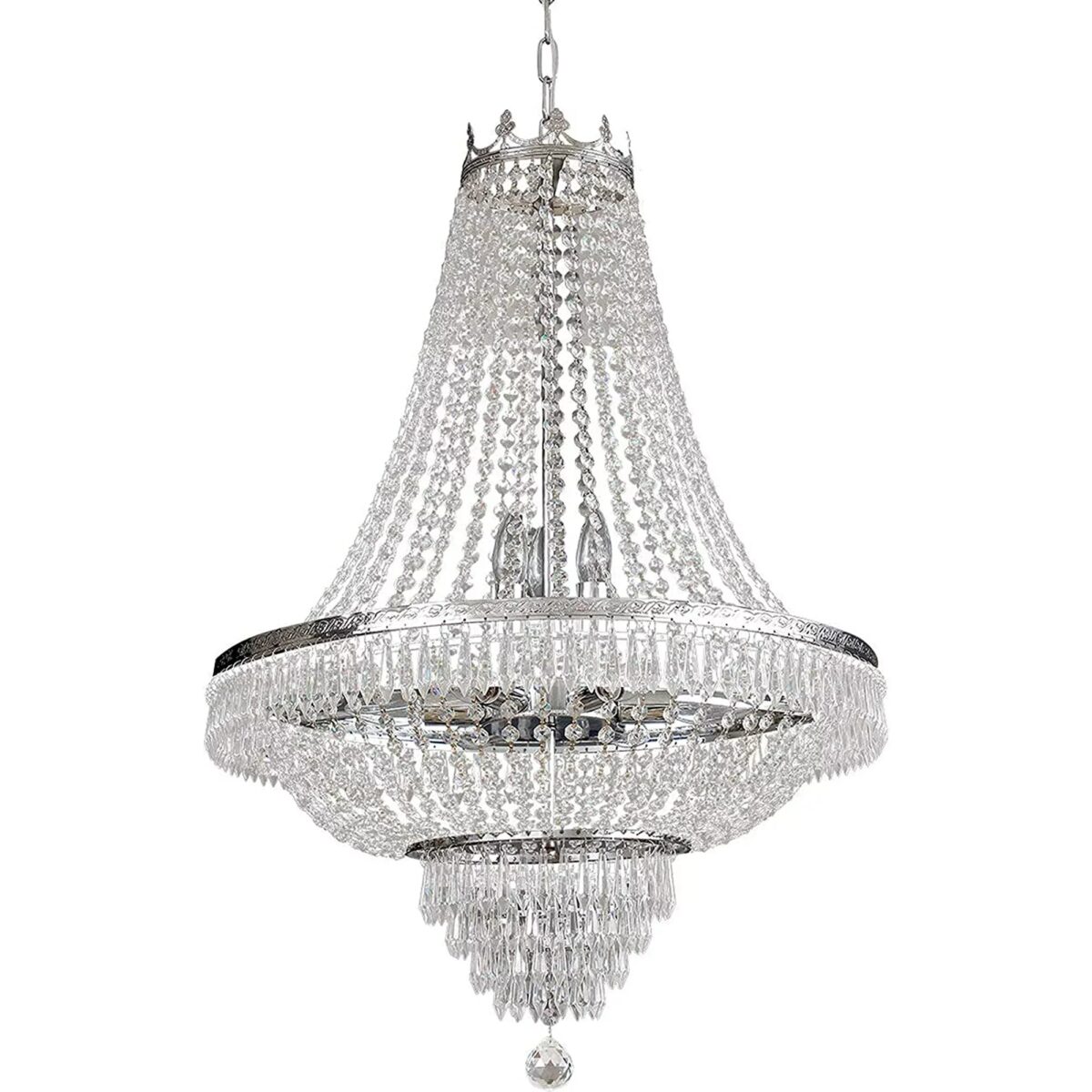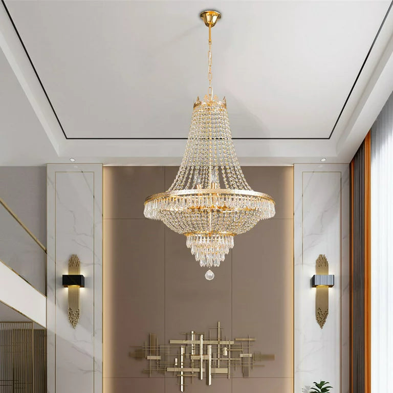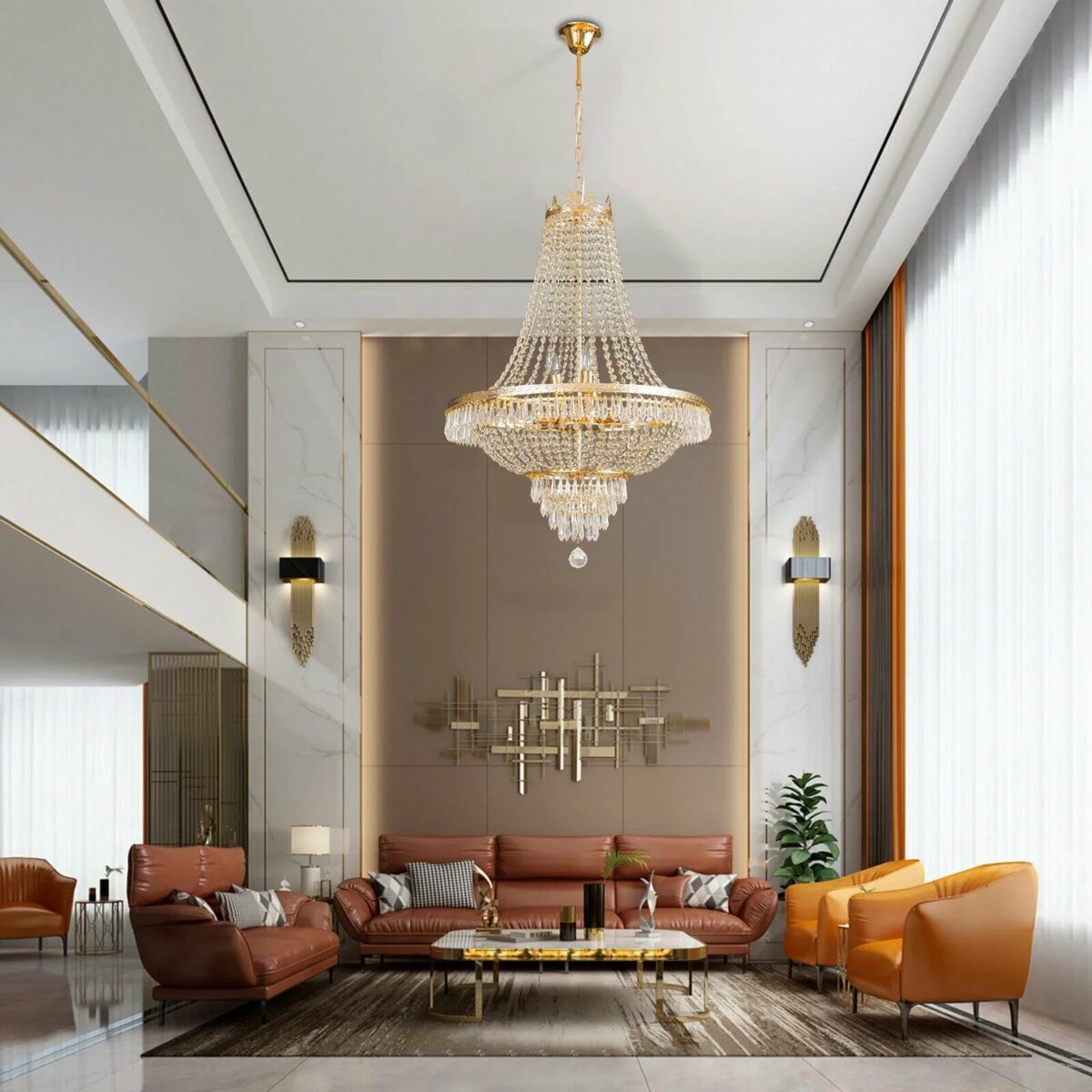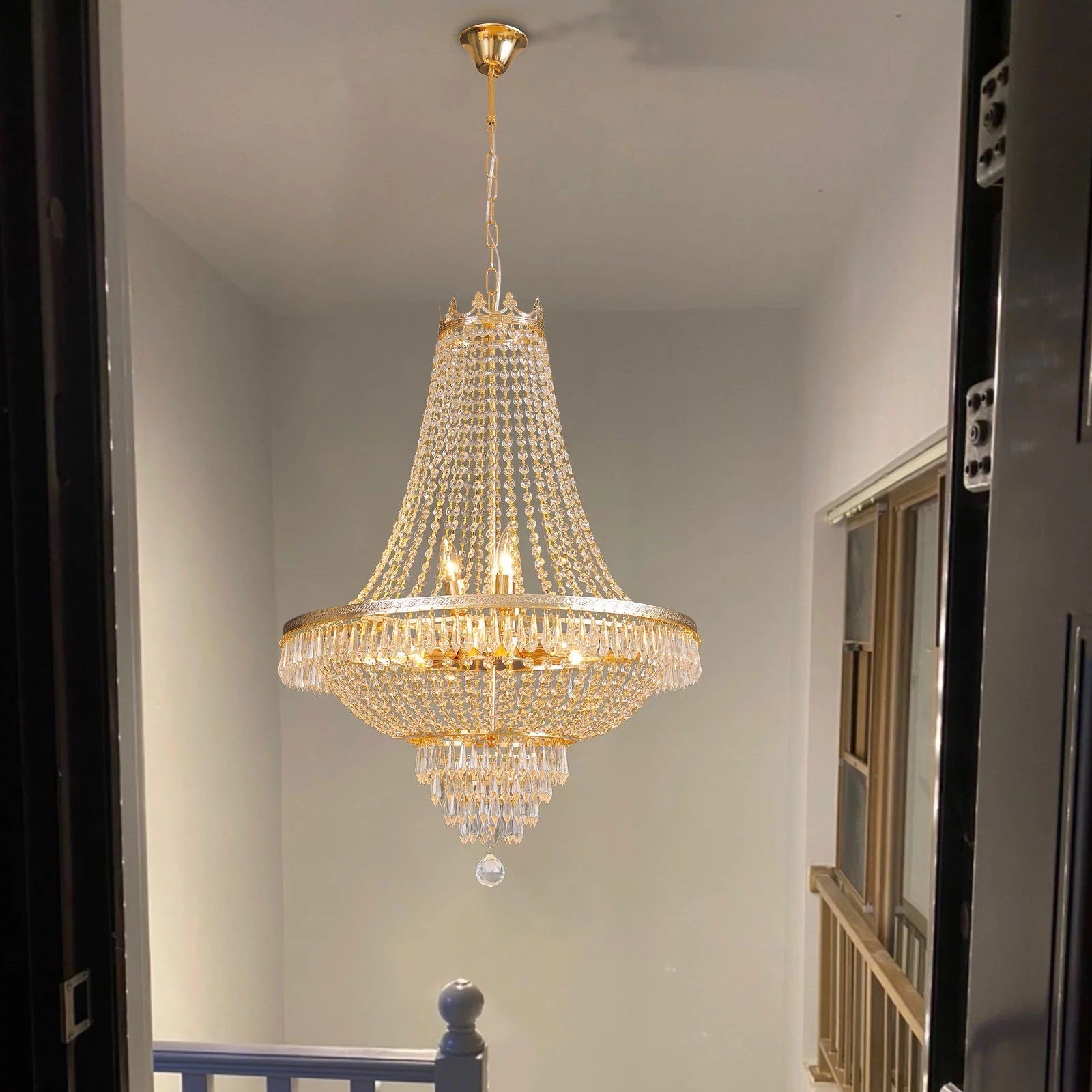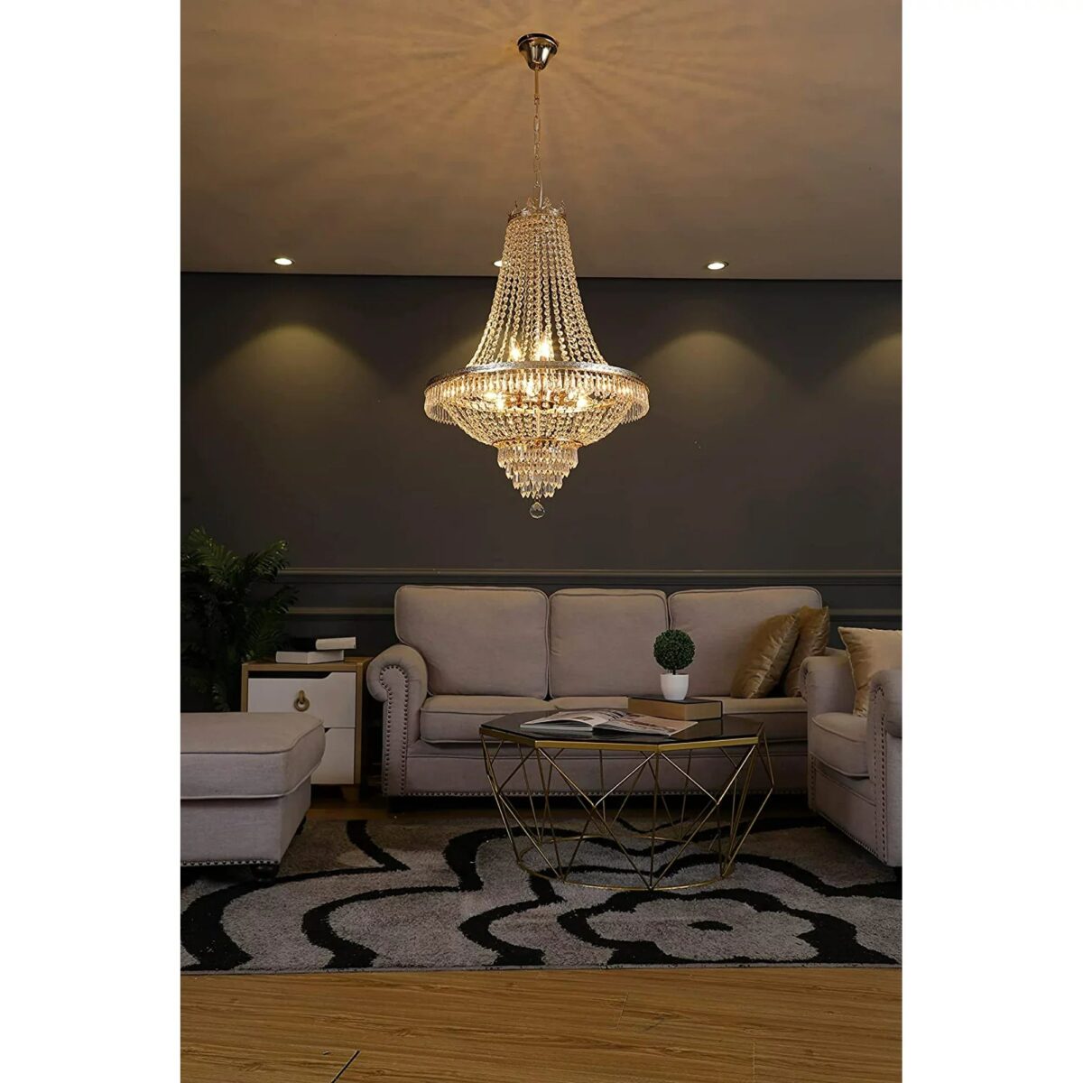 This elegant light luxury crystal chandelier combines contemporary modern style with the timelessly classic appearance of crystal. Available in either gold or chrome finishes, it is the perfect addition for a dining room, living room, or staircase.