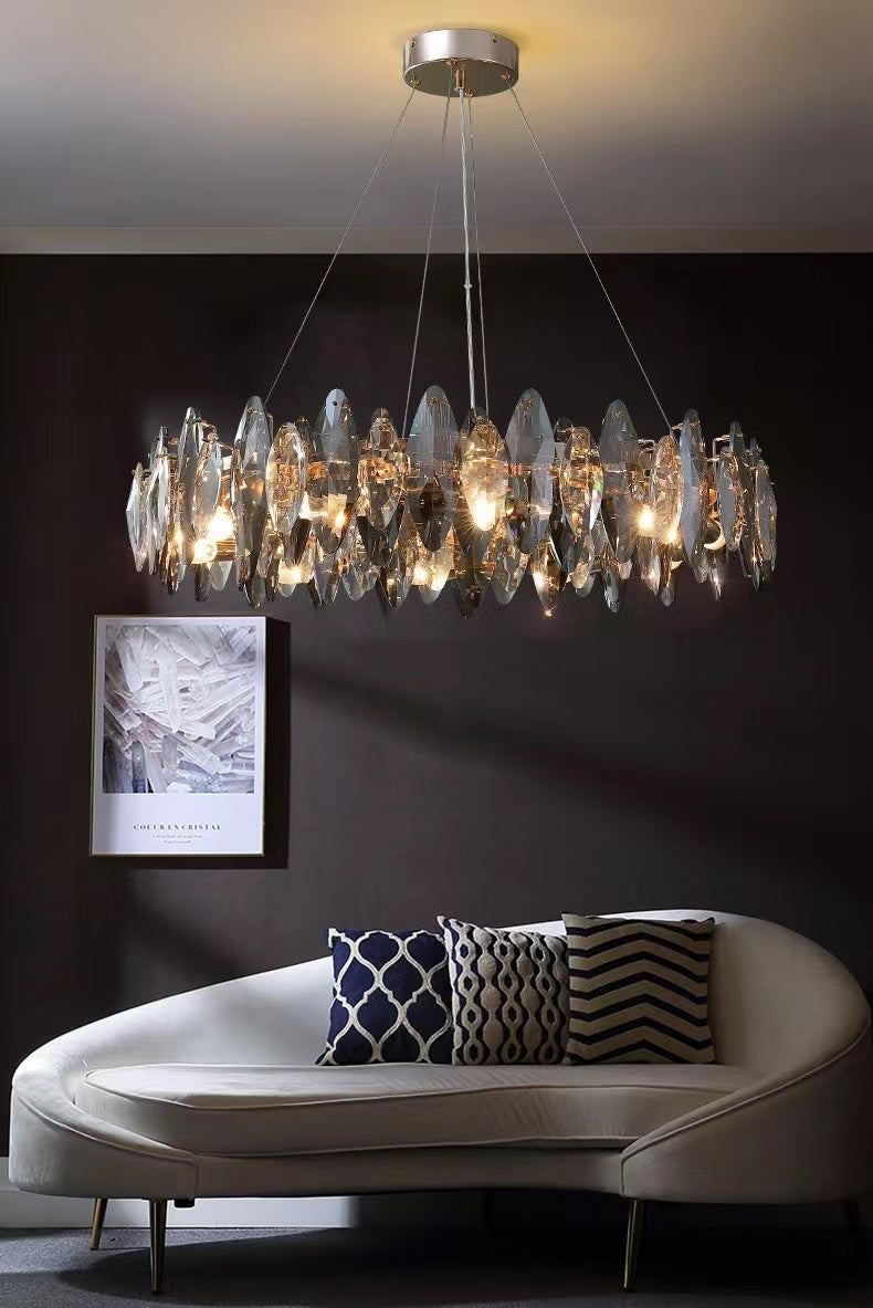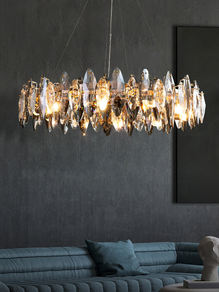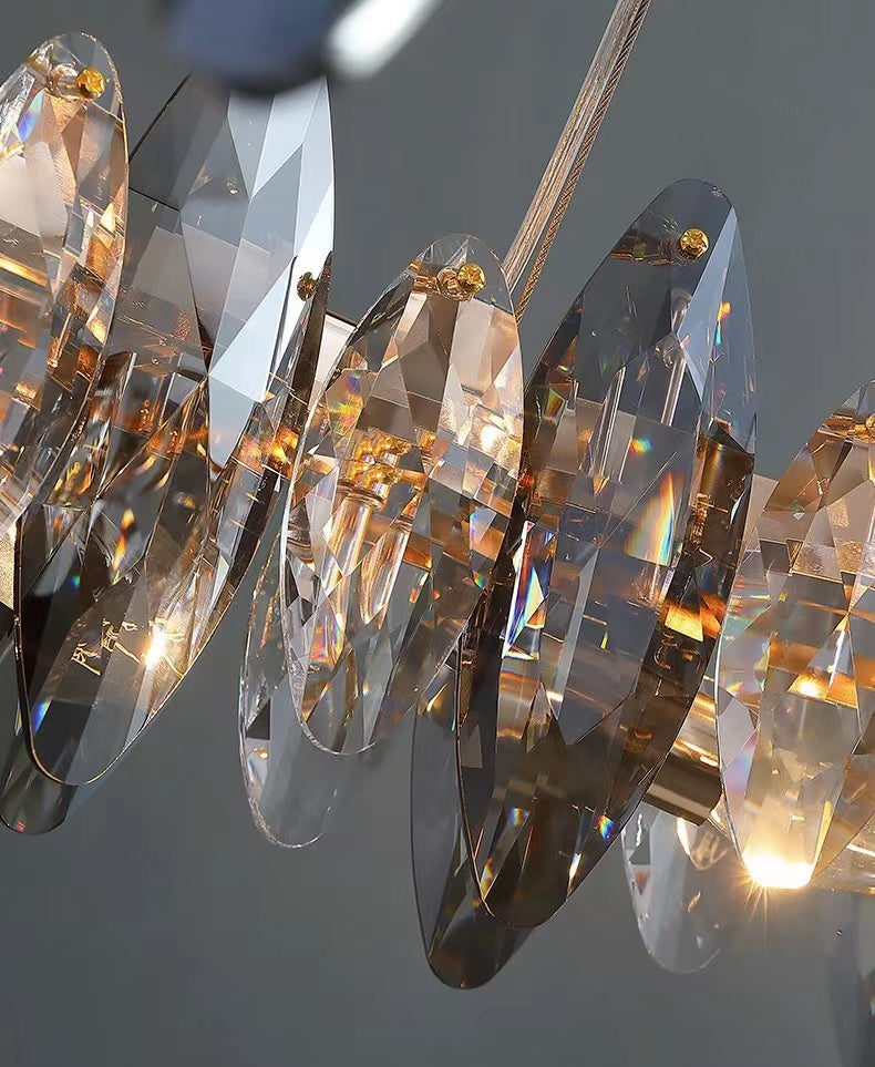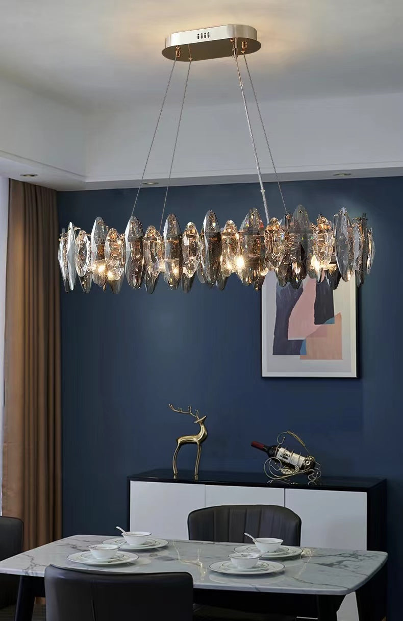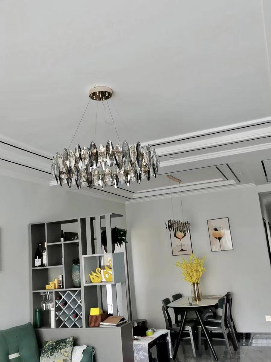 This series of chandelier suit features numerous oval facet crystal slices combining together for a split-level effect. This home set crystal ceiling light fixture is designed with superior quality and hand-picked K9 crystals in smokey grey color, which make the room extremely glittering and shinning. Full of cool modern sense. Two types to choose from: the round shape is more suitable for bedroom and living room, and the long oval shape matches kitchen island or dining table well.