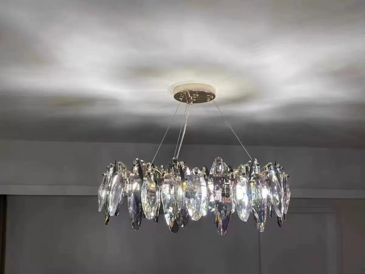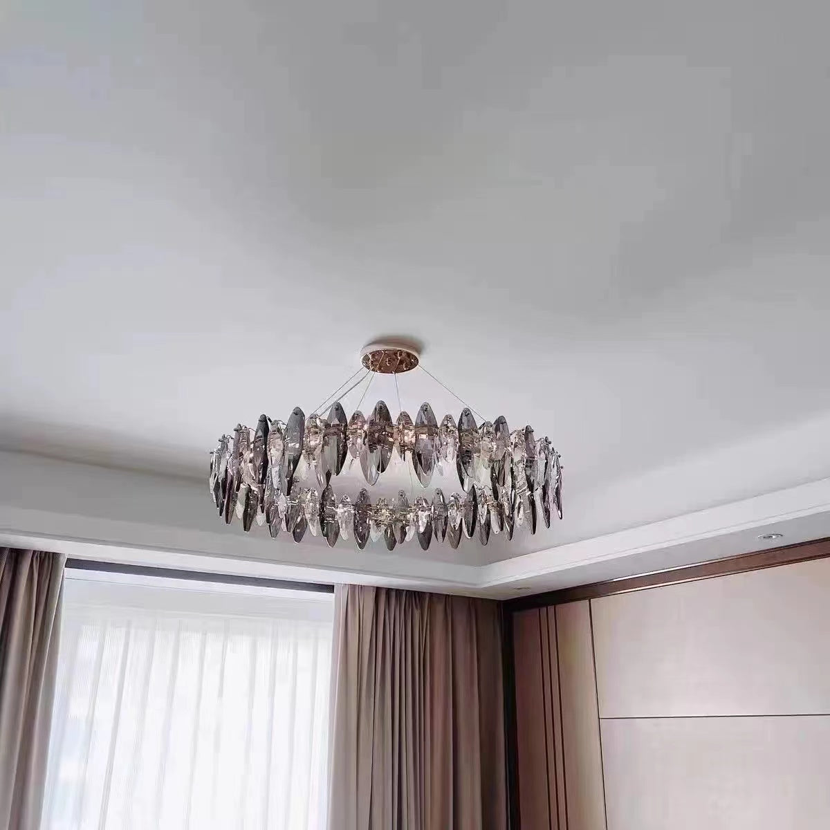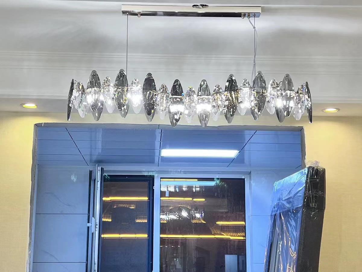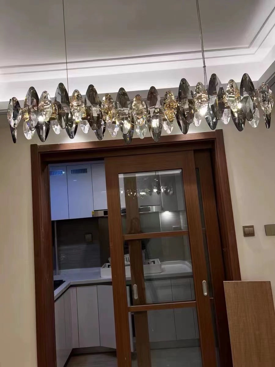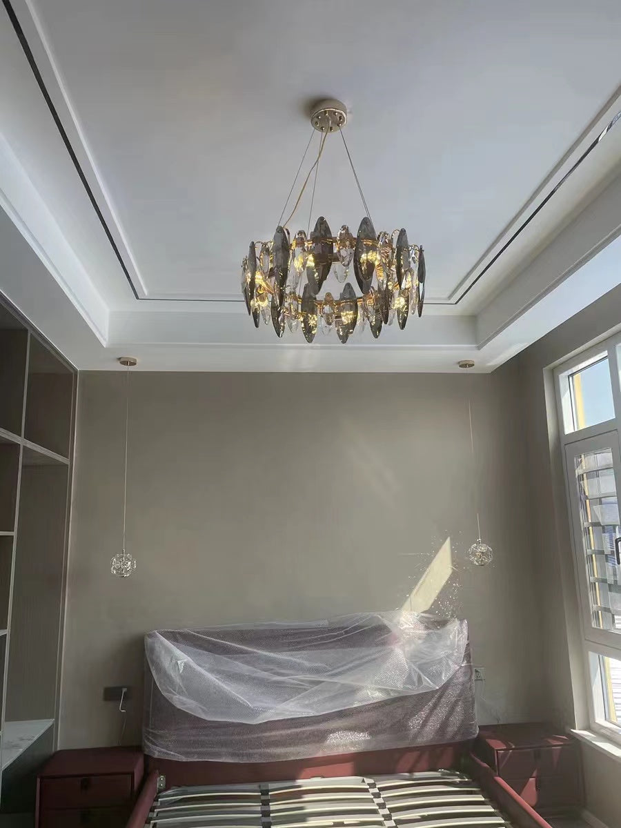 This series of chandelier suit features numerous oval facet crystal slices combining together for a split-level effect. This home set crystal ceiling light fixture is designed with superior quality and hand-picked K9 crystals in smokey grey color, which make the room extremely glittering and shinning. Full of cool modern sense. Two types to choose from: the round shape is more suitable for bedroom and living room, and the long oval shape matches kitchen island or dining table well.
