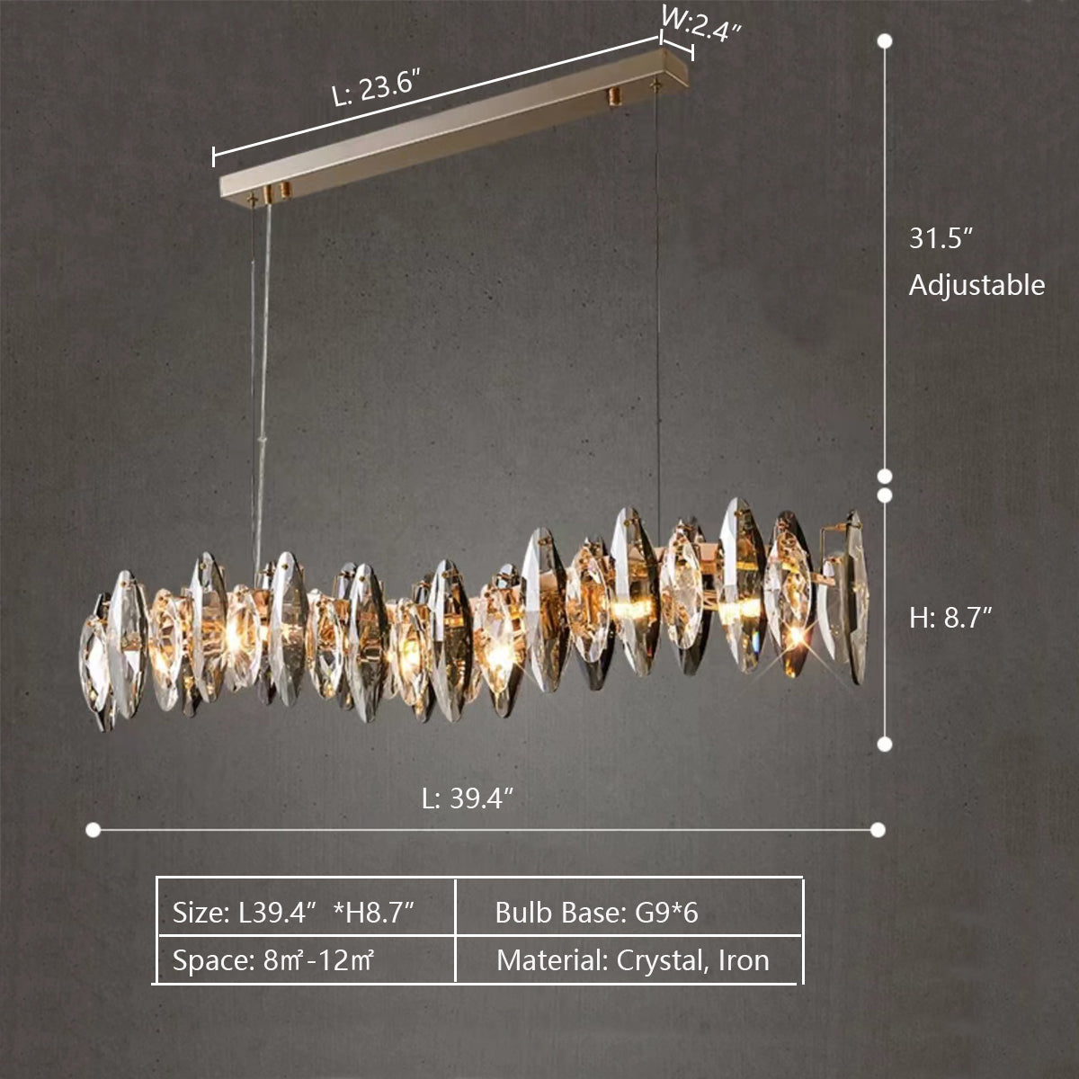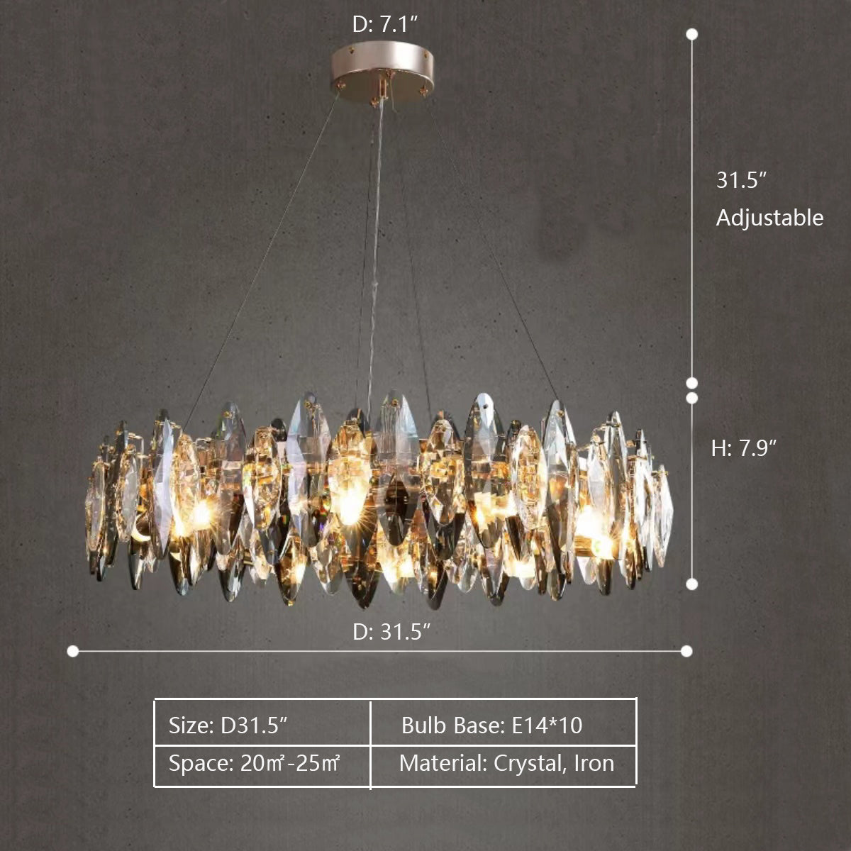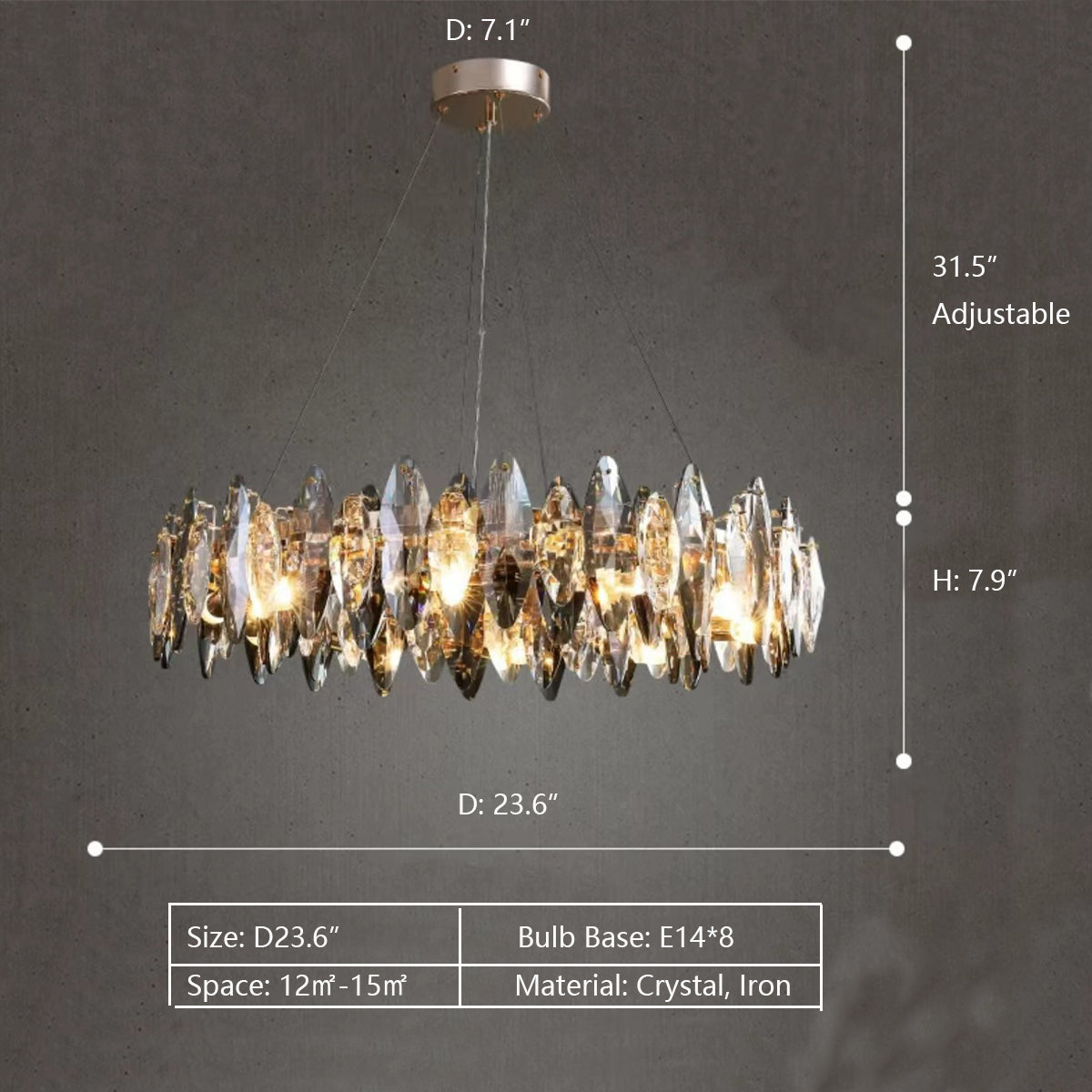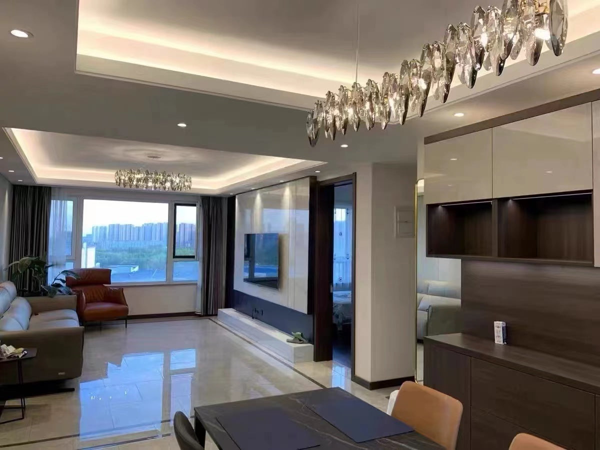 This series of chandelier suit features numerous oval facet crystal slices combining together for a split-level effect. This home set crystal ceiling light fixture is designed with superior quality and hand-picked K9 crystals in smokey grey color, which make the room extremely glittering and shinning. Full of cool modern sense. Two types to choose from: the round shape is more suitable for bedroom and living room, and the long oval shape matches kitchen island or dining table well.