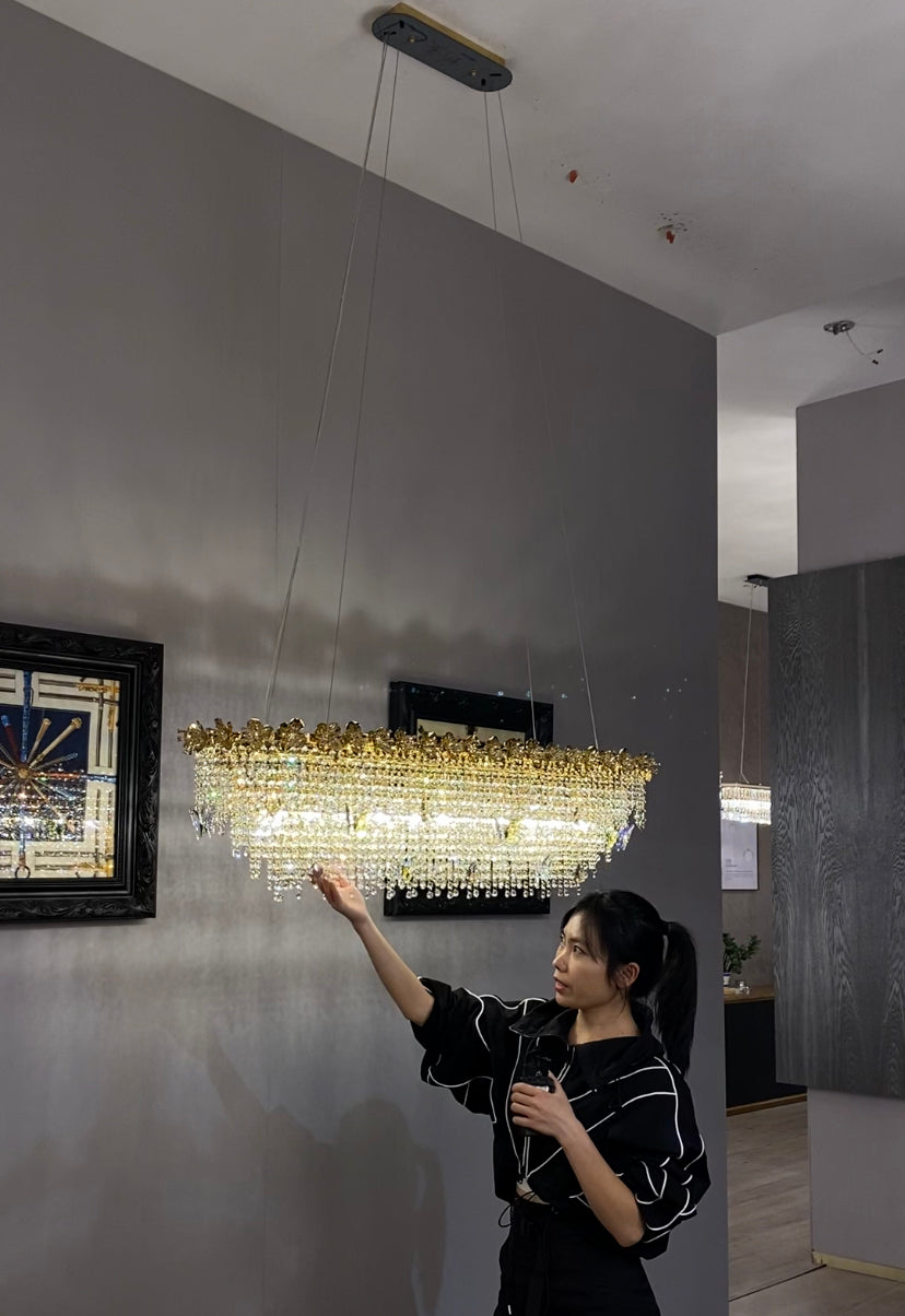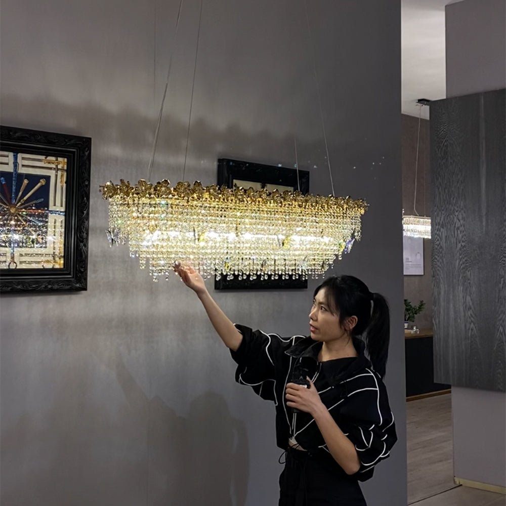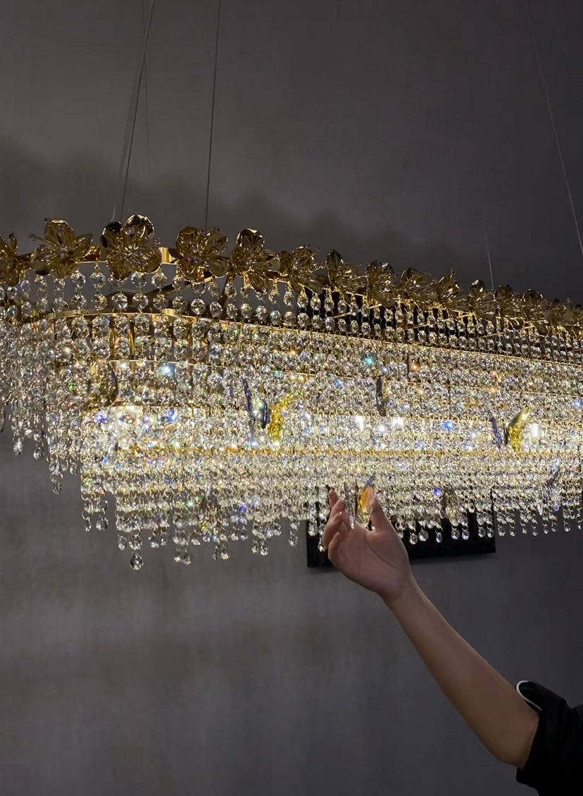 Elevate your dining experience with our Modern Rectangle Gold Flower Crystal Chandelier. Featuring a luxurious design and perfect for any dining table or kitchen island, this chandelier adds a touch of elegance to your space. Crafted with precision and sophistication, it’s the perfect addition to your home.