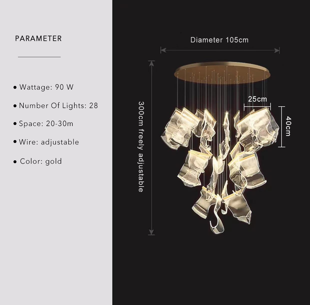 This incredible, translucent light fixture is a true vision of beauty. With irregular leaf-like shape acrylic accents and brilliant LED lights, you will love the fixture this piece in your home. Three different colours and two light options, all guarantee to become the elegant fixture you’ve been searching for. It will enhance your living room or staircase greatly and widely creats a high-end elegance.