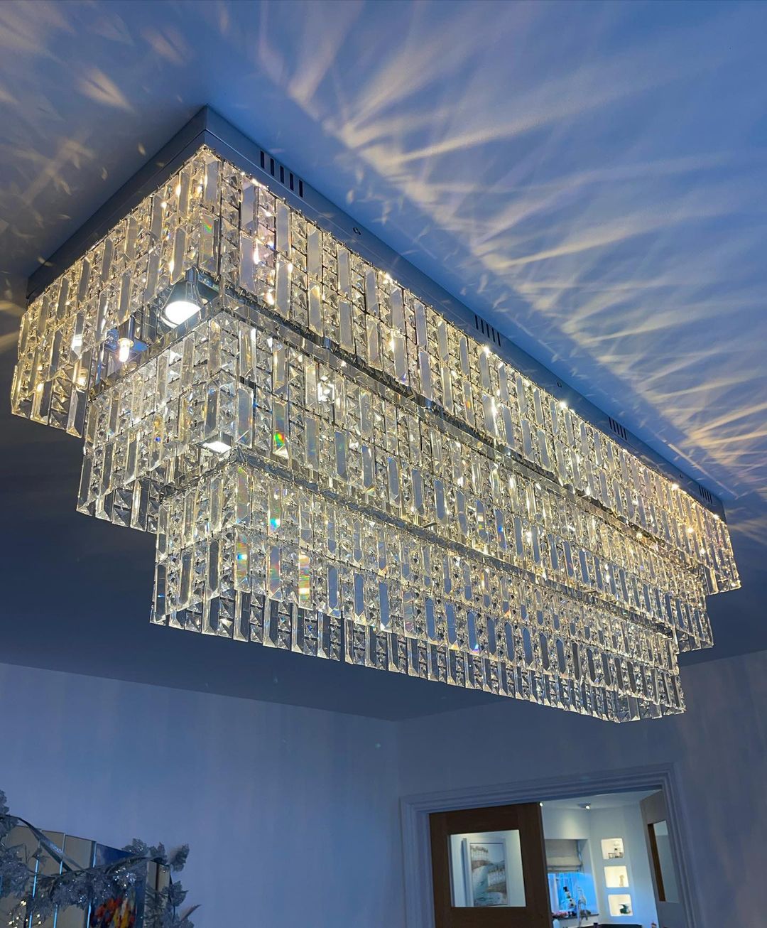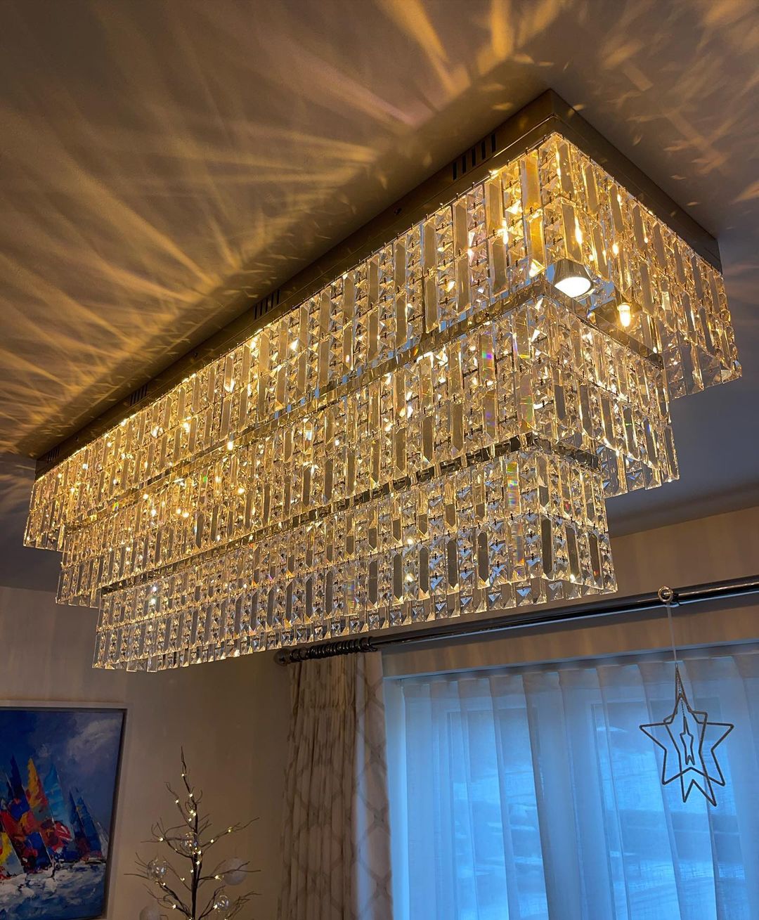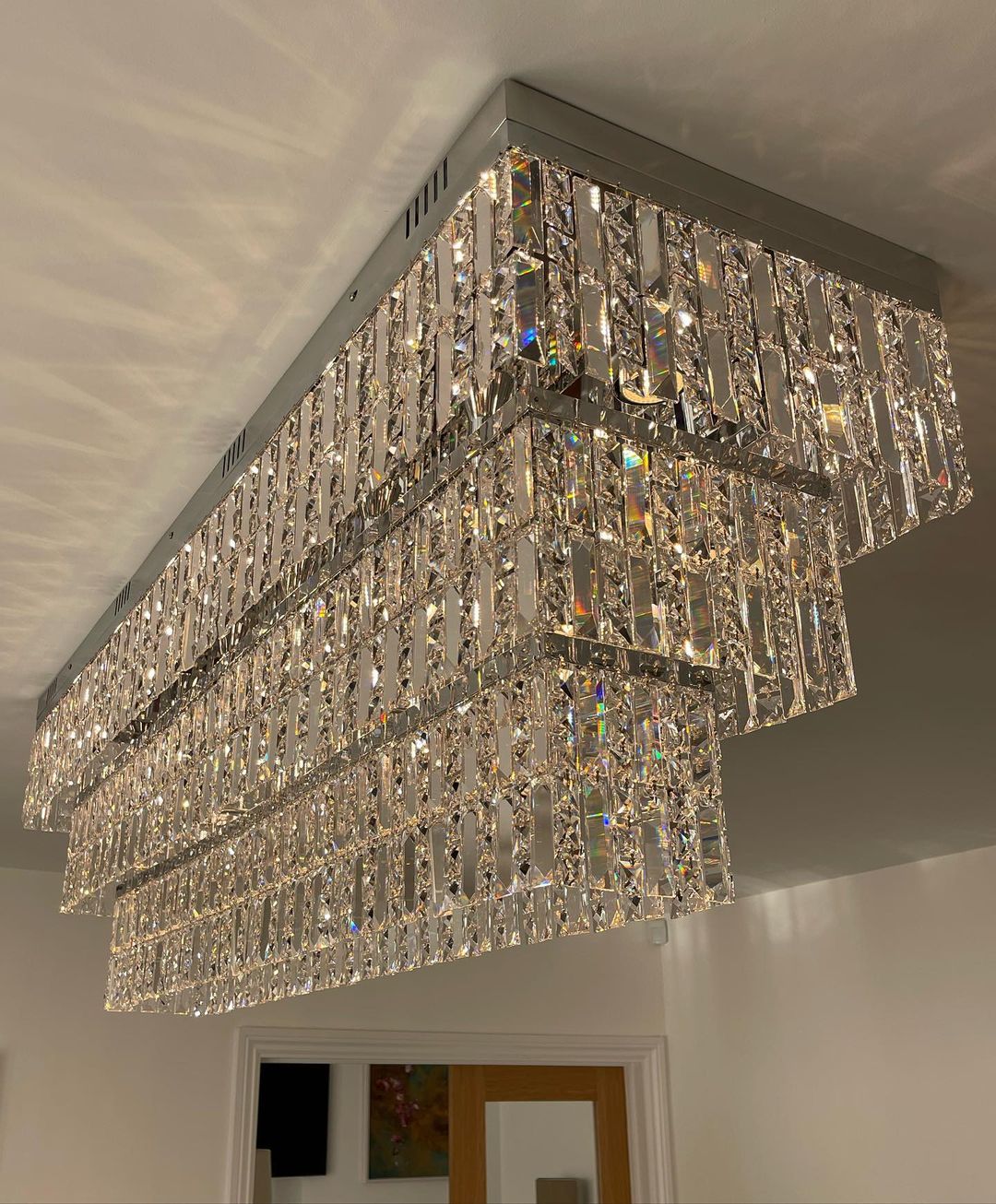 This luxurious chandelier consists of three layers of crystal tassles well arranged in rectangle form, showcasing the appreciation of orderliness. Full of modern sense. The layer upon layer of crystal strands radiate the light  in different directions for a dazzling and wondrous effect. Extra large size, perfect for large living room and dining room, home office or commercial areas.
