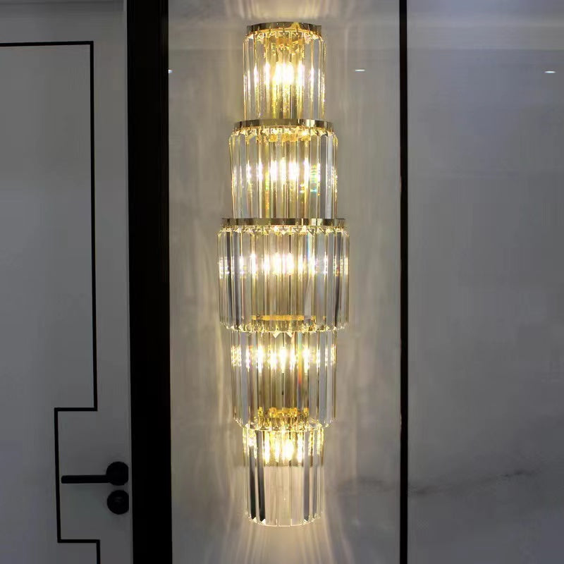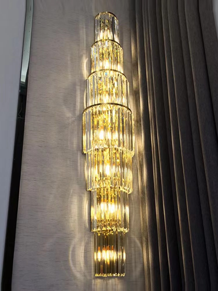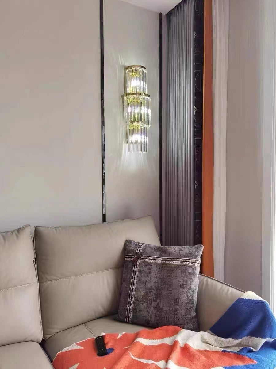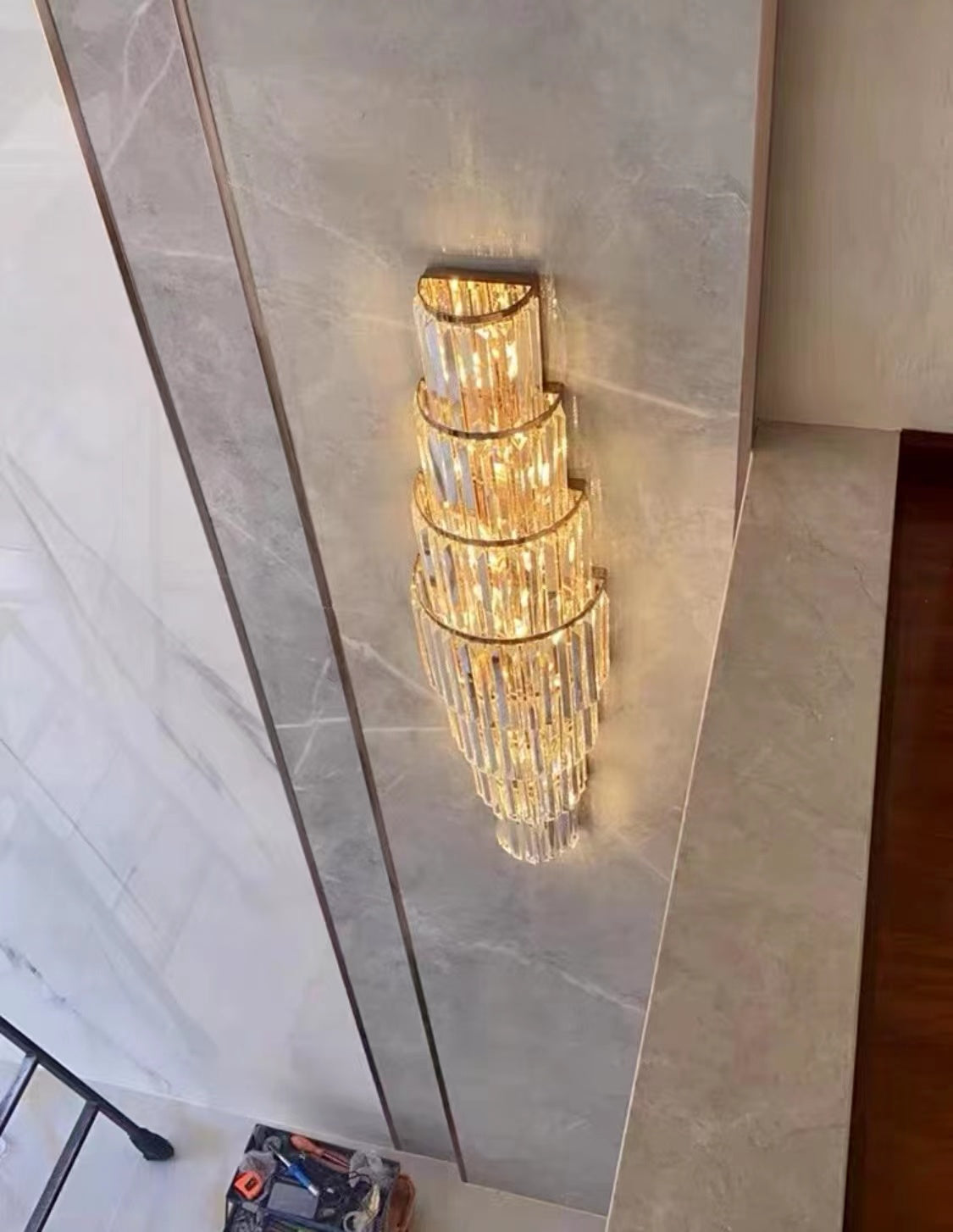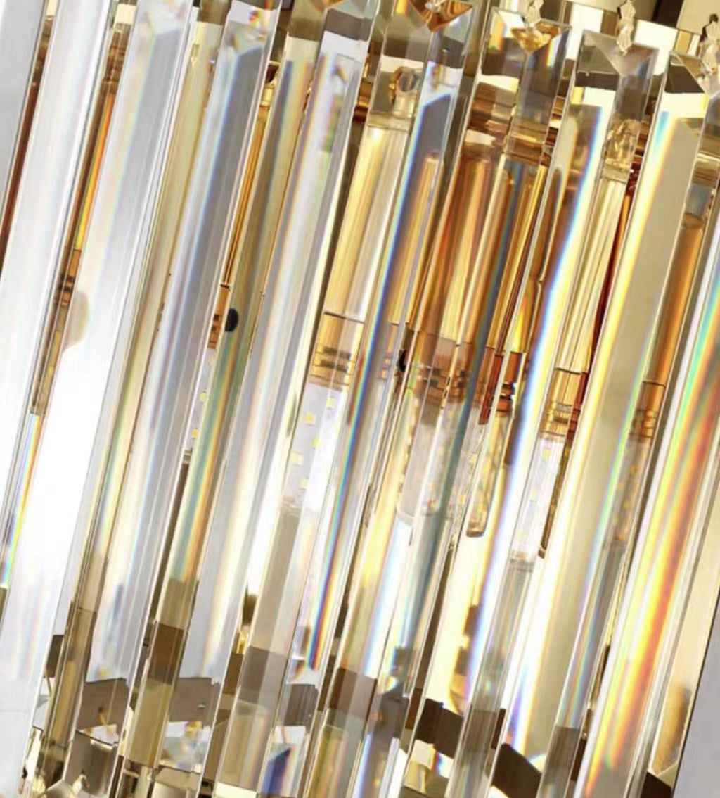 This series of wall lights features crystal semi-arc blocks connected as transformed honeycomb shape in gold finish. Bright, luxurious, and glamorous, this wall light makes a grand impression to every vistor to your place. Full of modern sense no matter light is turned on or not. Available in three sizes, gold of color, texture, and warm highlights fill up the glass forms as LED light shines through them.
