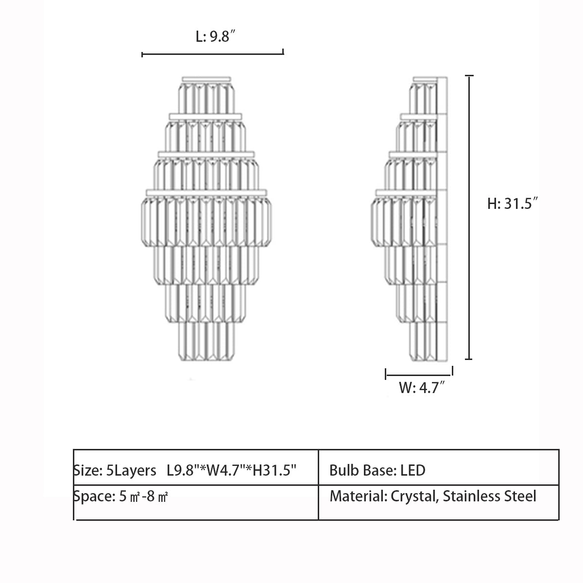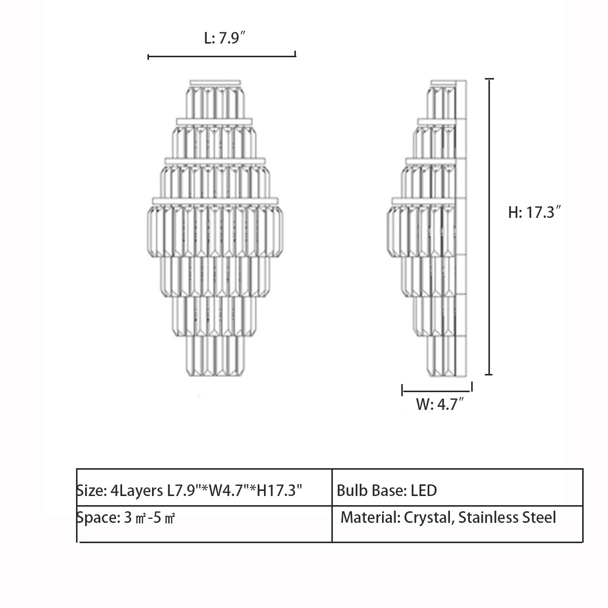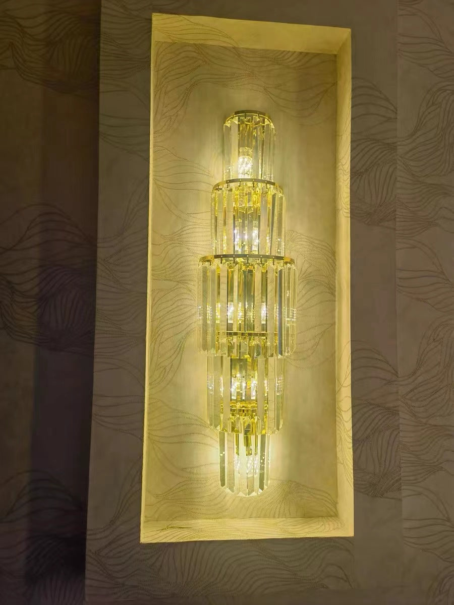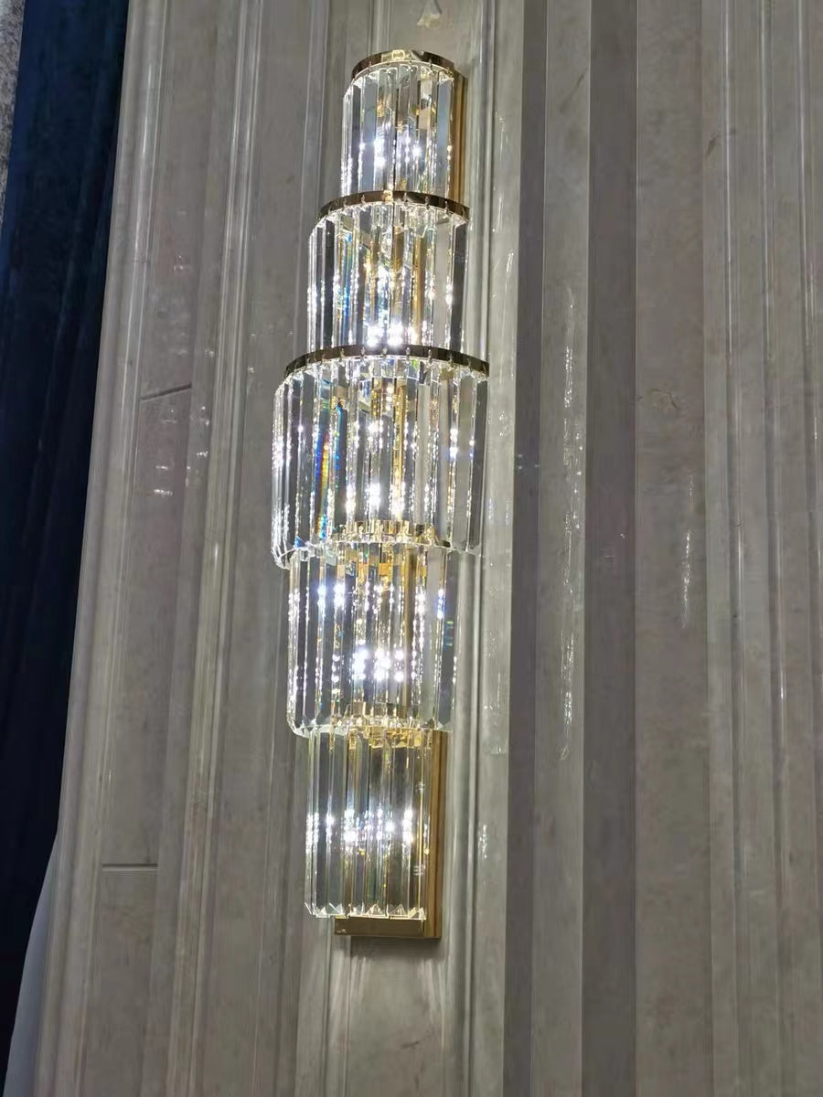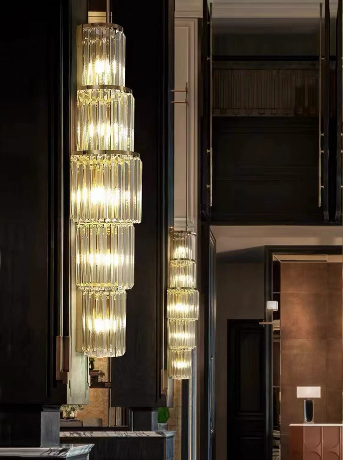 This series of wall lights features crystal semi-arc blocks connected as transformed honeycomb shape in gold finish. Bright, luxurious, and glamorous, this wall light makes a grand impression to every vistor to your place. Full of modern sense no matter light is turned on or not. Available in three sizes, gold of color, texture, and warm highlights fill up the glass forms as LED light shines through them.