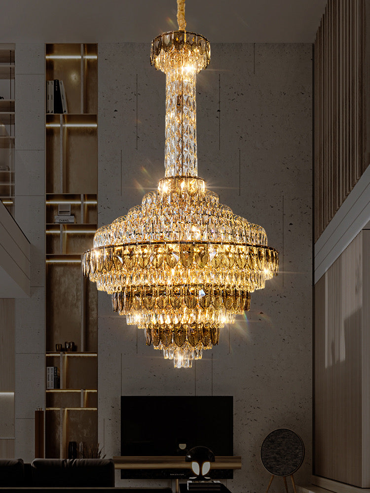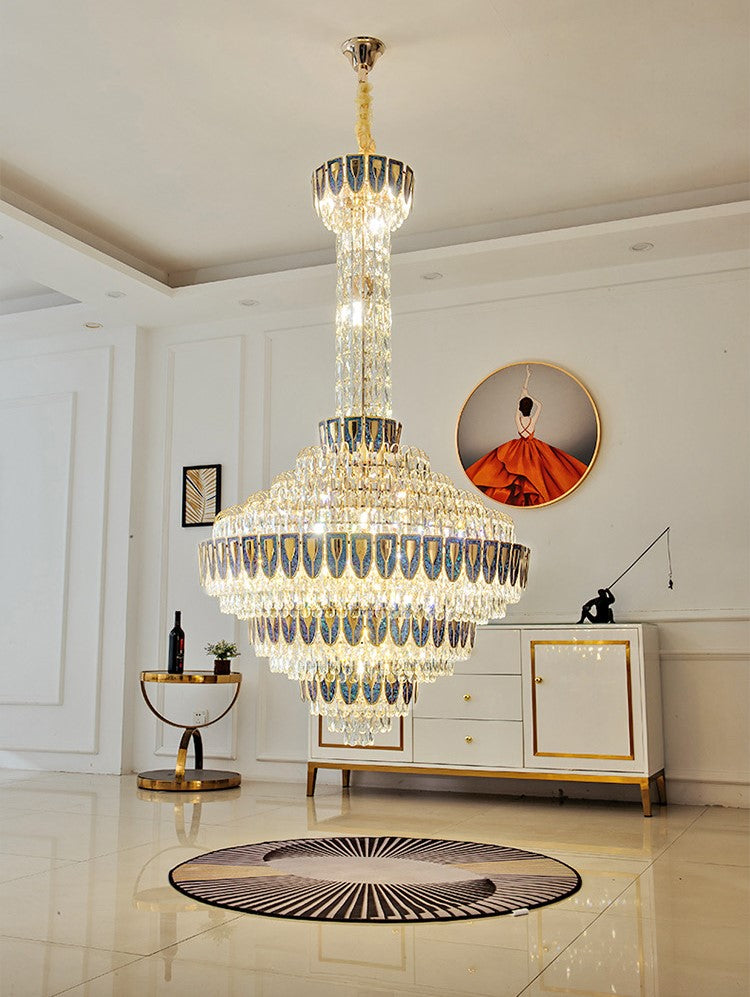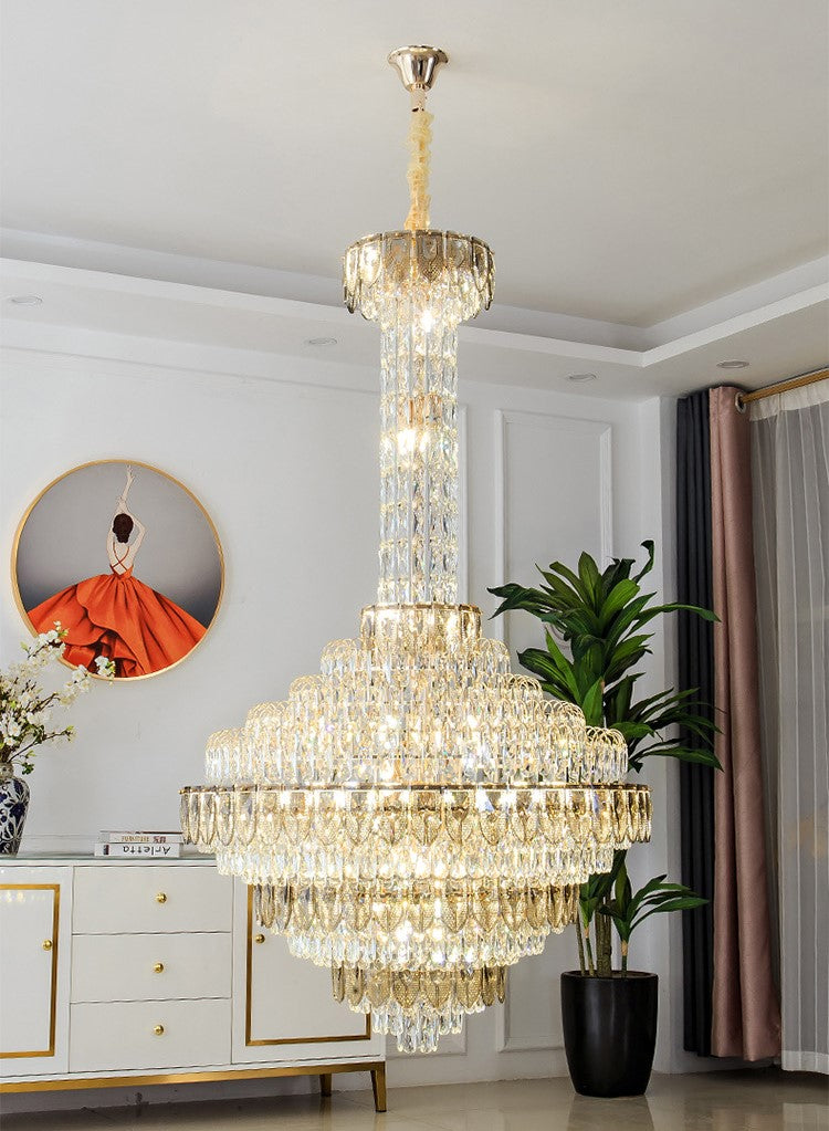 The European empire style crystal chandelier is an artwork of craftsmanship and beauty. This chandelier consists of two parts: the upper part is numerous crystal rods in the shape of rectangle, regularly arranged like a long neck; the lower main part is like a huge crystal bowl or an inverted dome with a layered look. You will fall in love with this crystal chandelier once you saw it online, or even more when installed in your staircase, hallway, duplex, loft, villa.